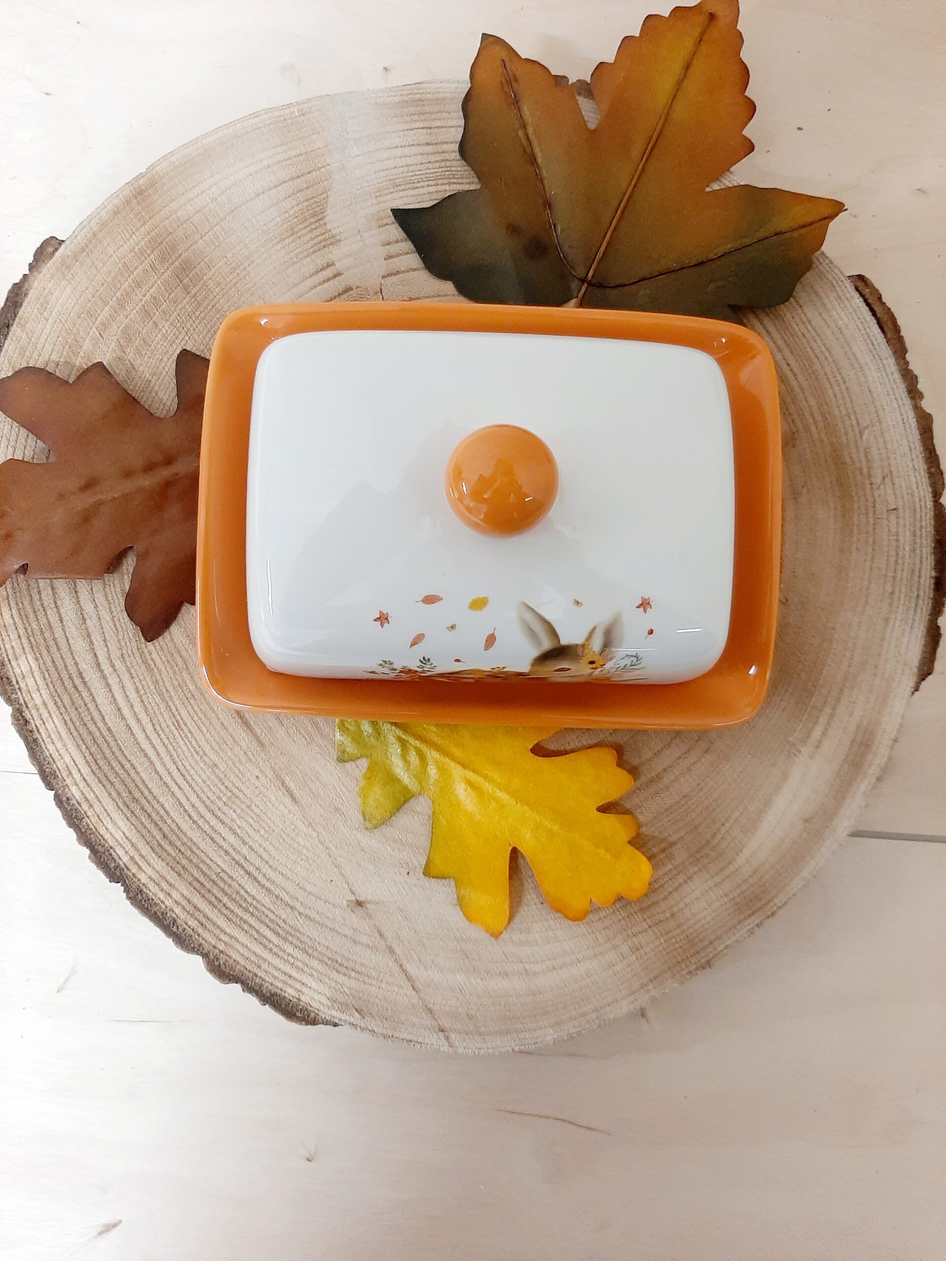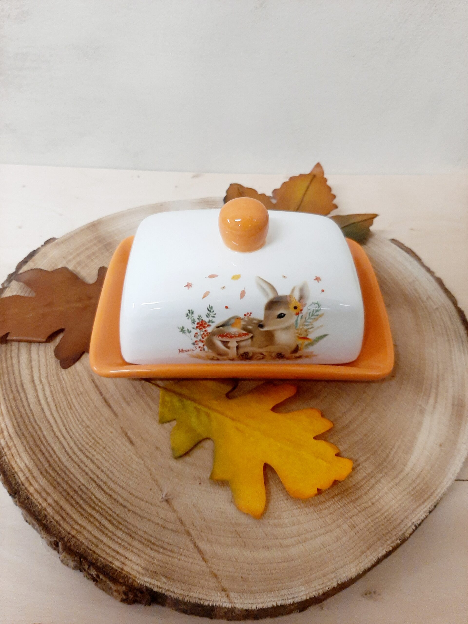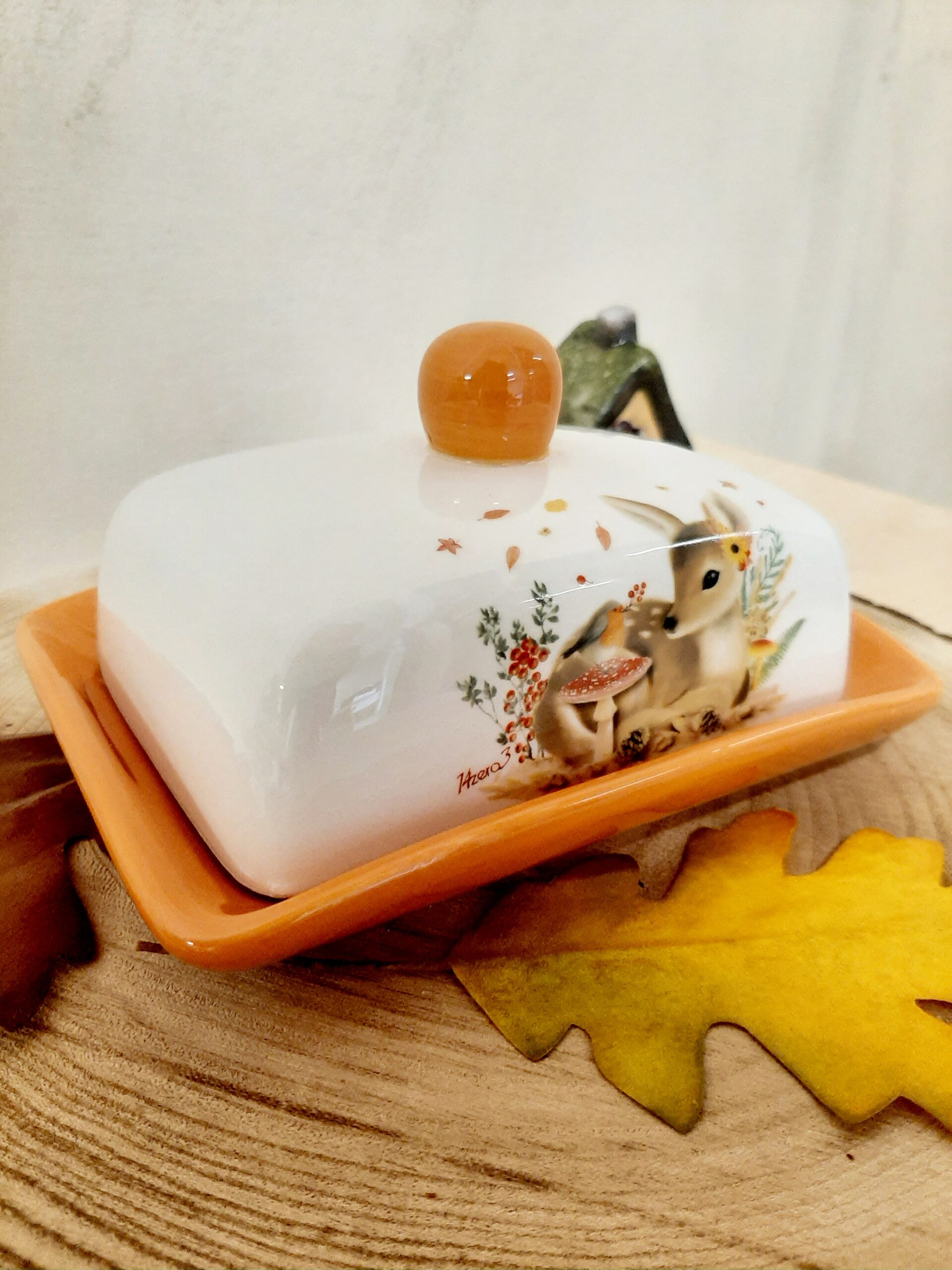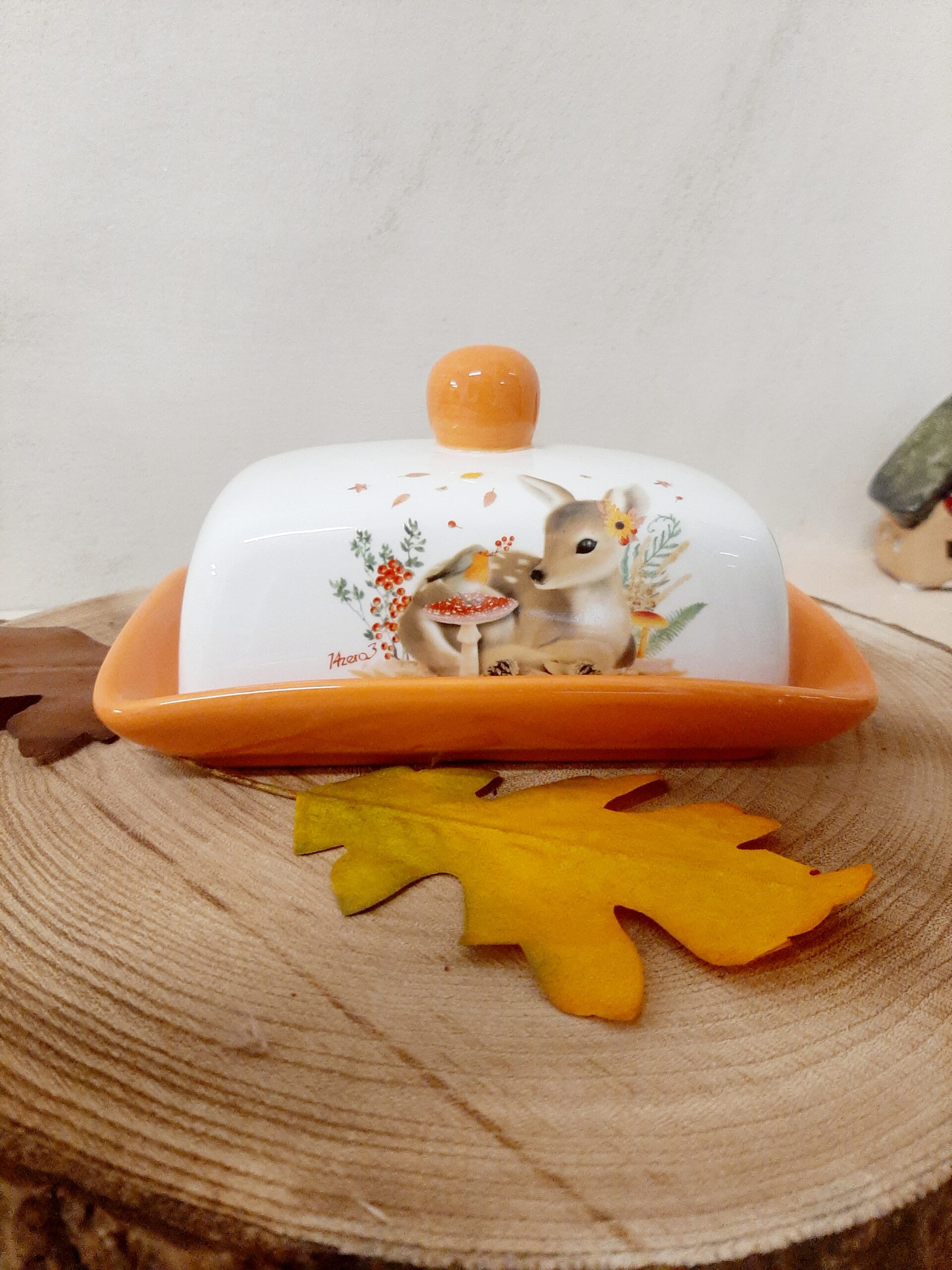 Portaburro autunnale in ceramica, base vassoio arancione con coperchio, decoro cerbiatto, in confezione regalo.