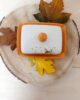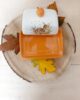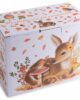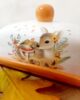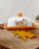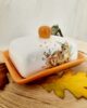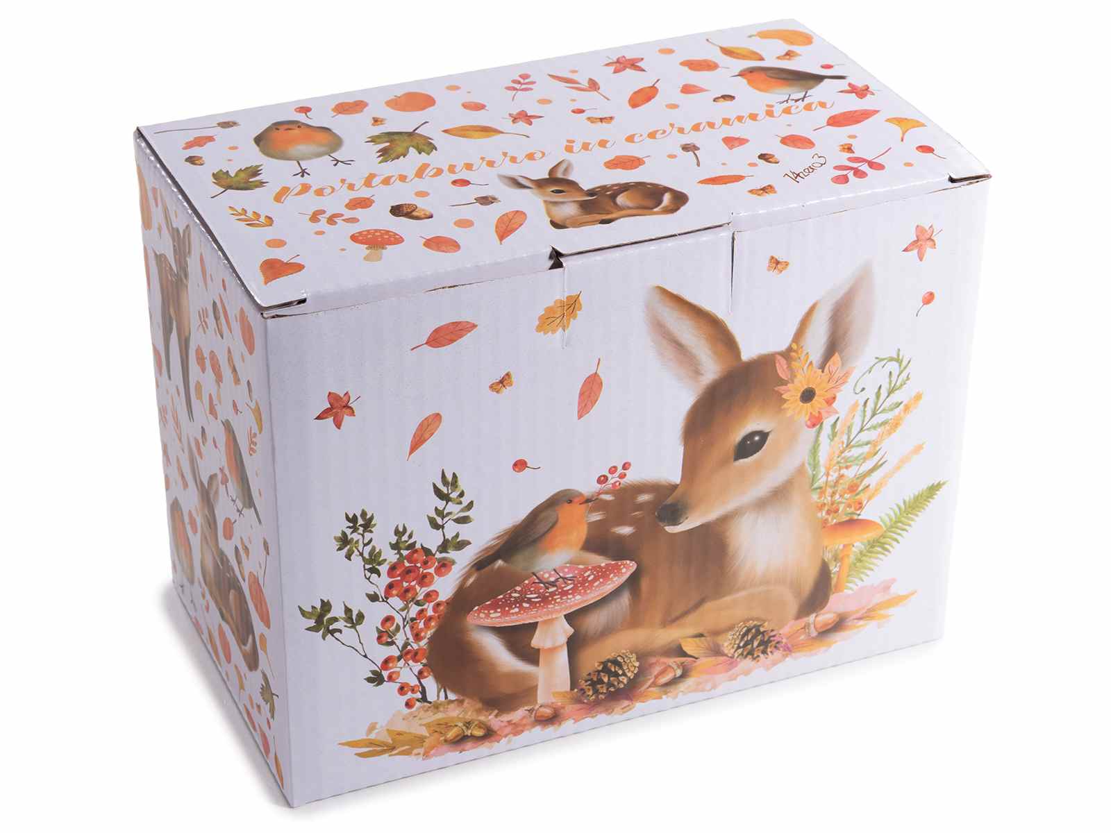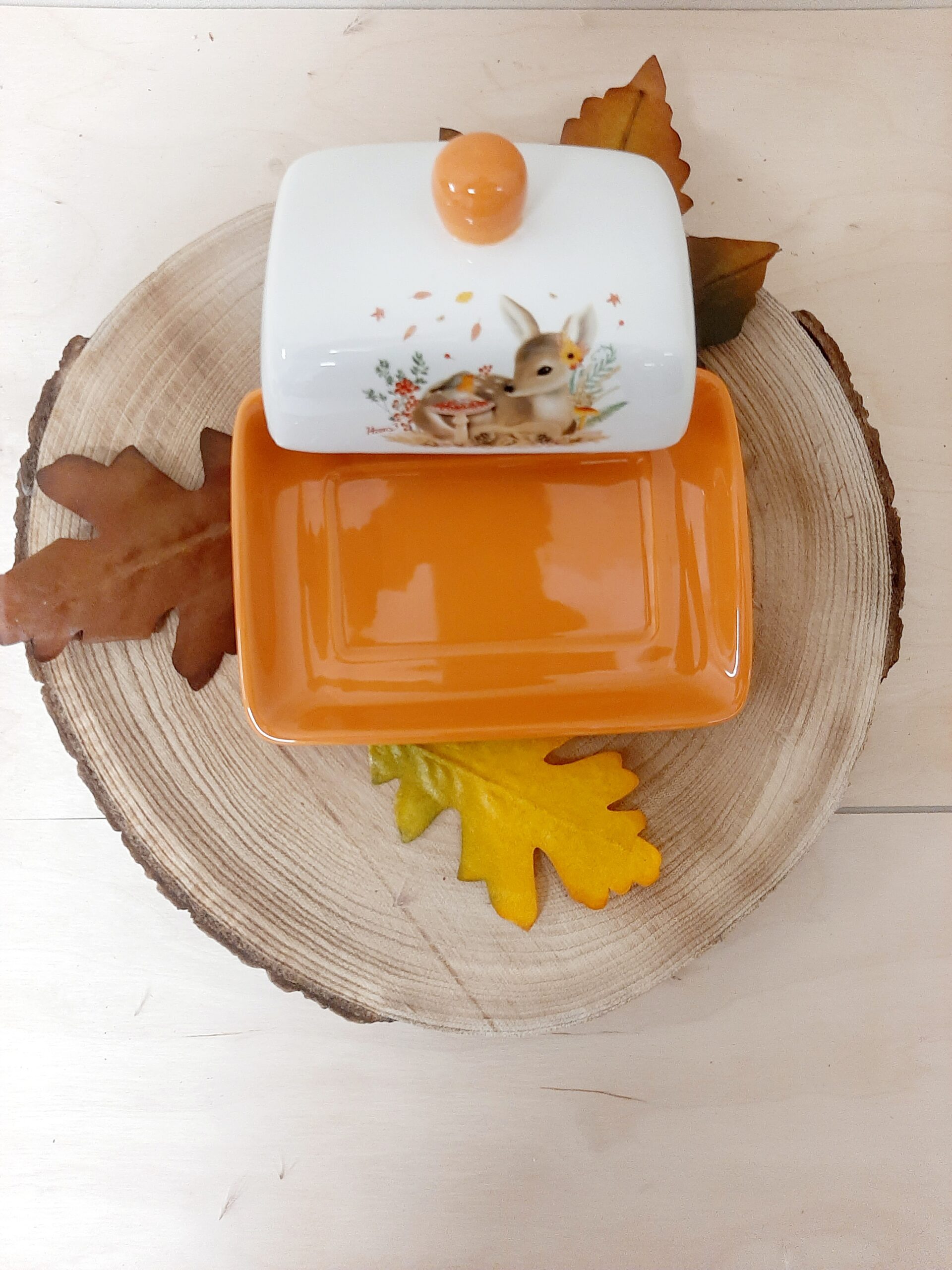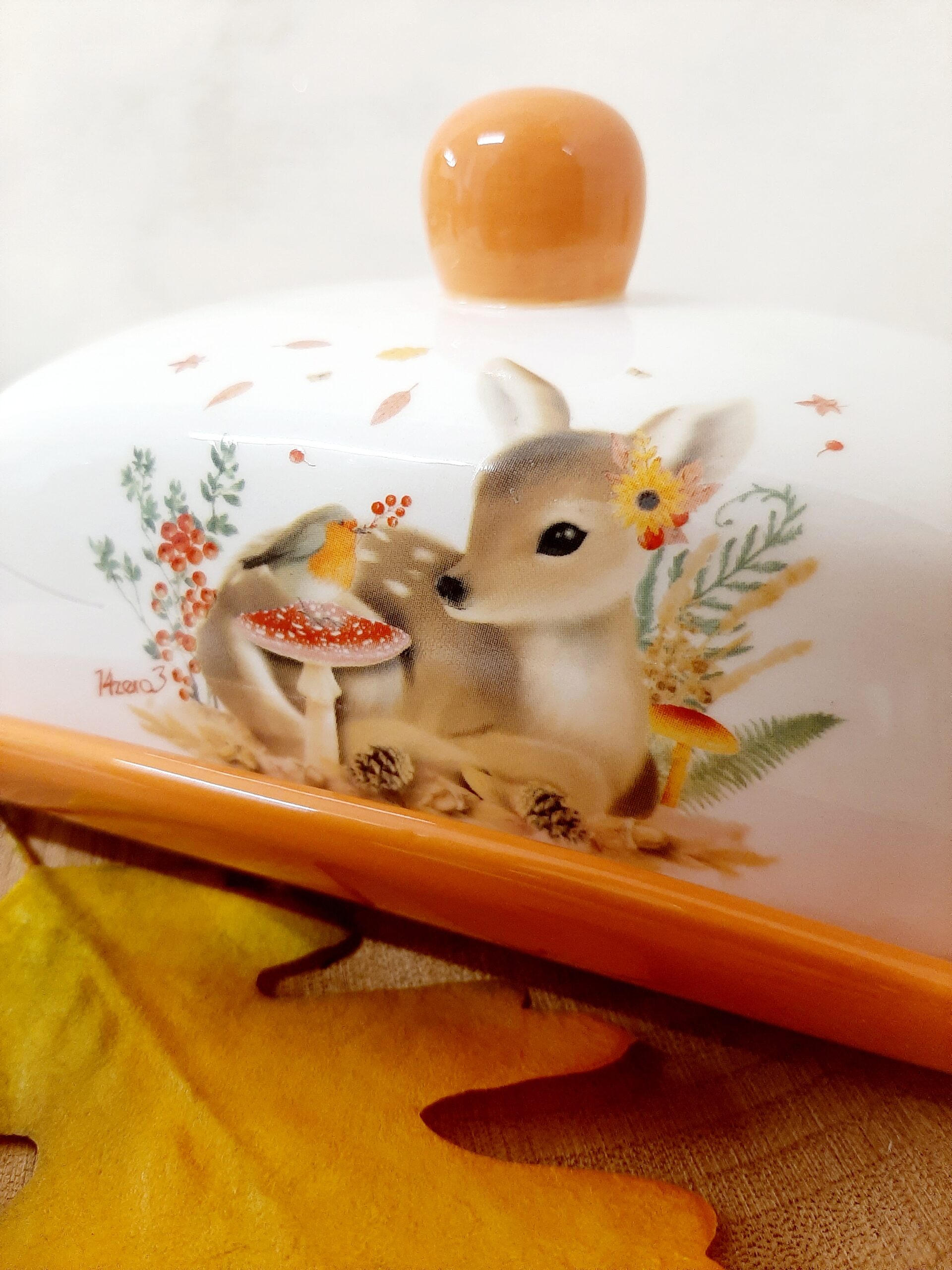 Portaburro autunnale in ceramica, base vassoio arancione con coperchio, decoro cerbiatto, in confezione regalo.
