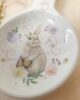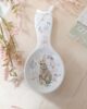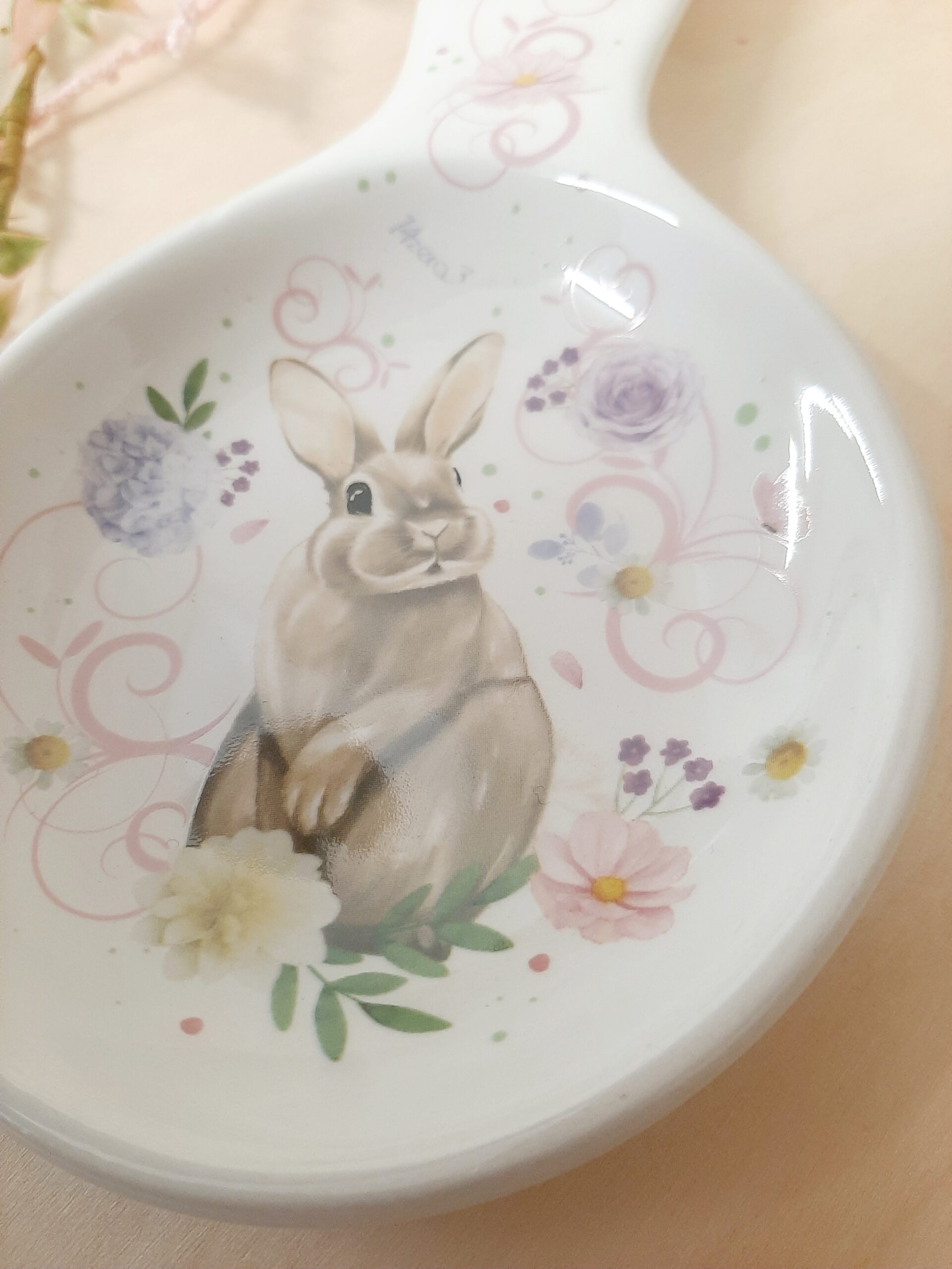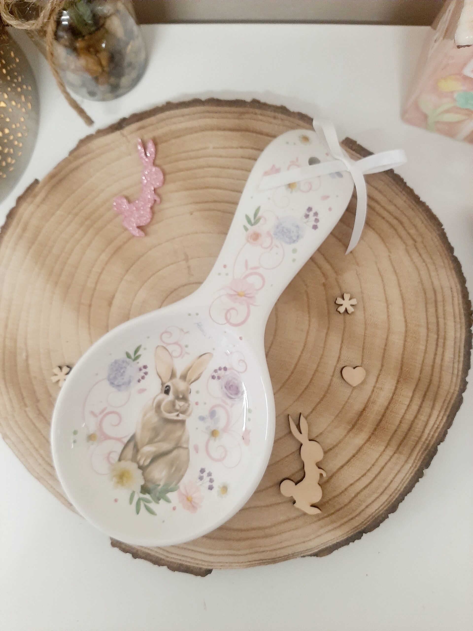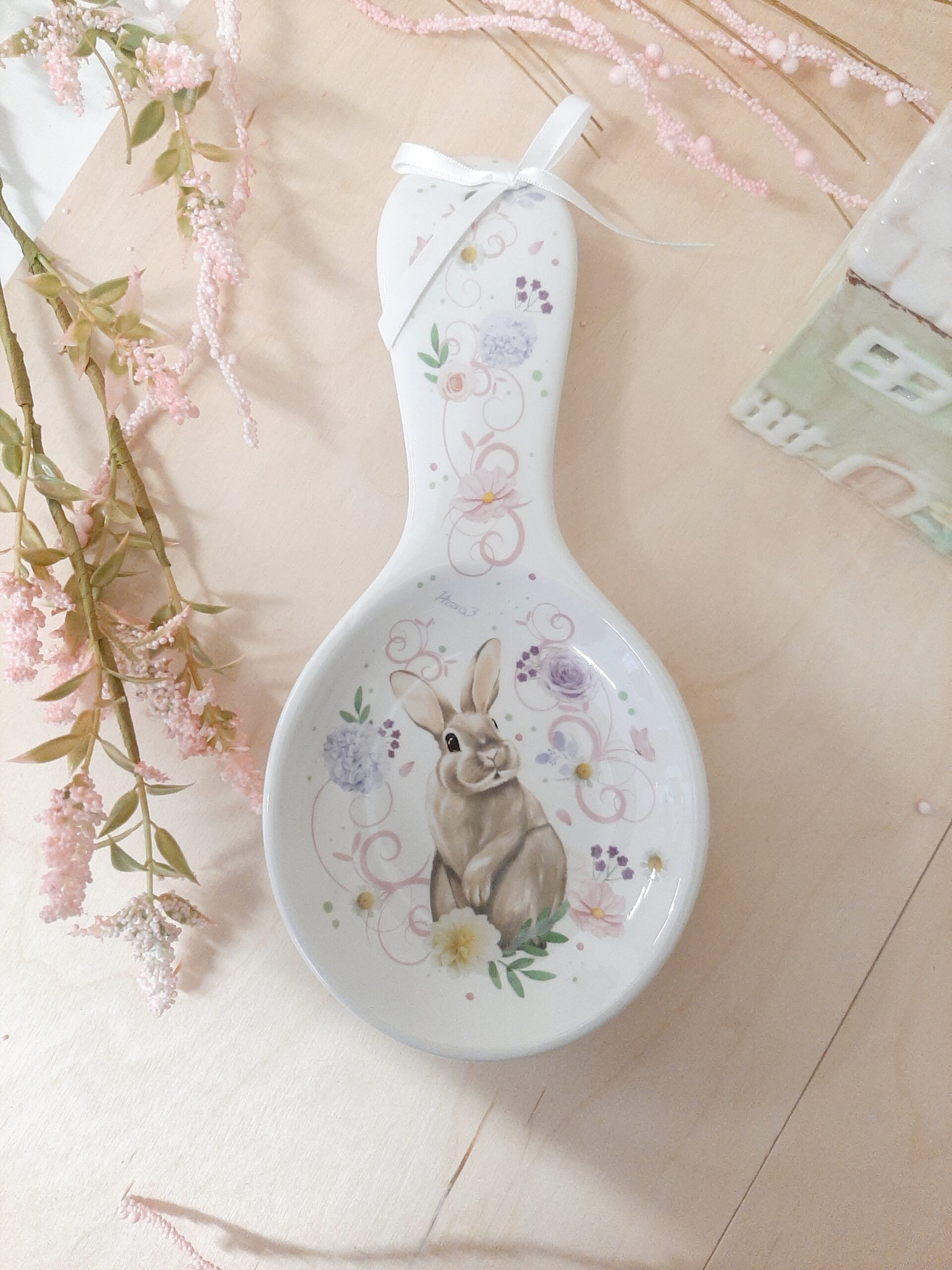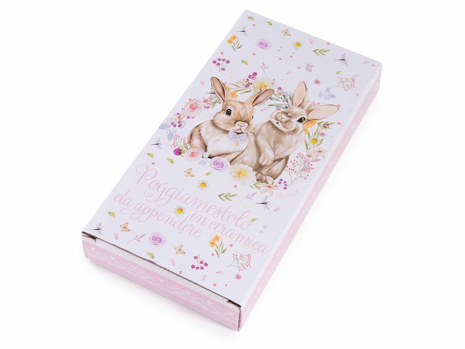 Poggiamestolo di Pasqua in ceramica con stampa coniglietti, fiocchetto decorativo e confezione regalo.