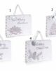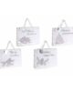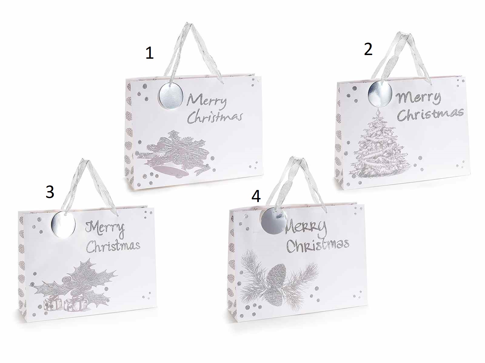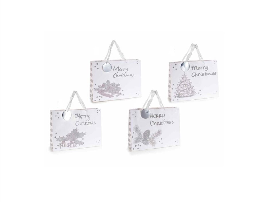 Sacchetto in carta bianco con stampa glitter natalizia, tag e manici argento.