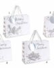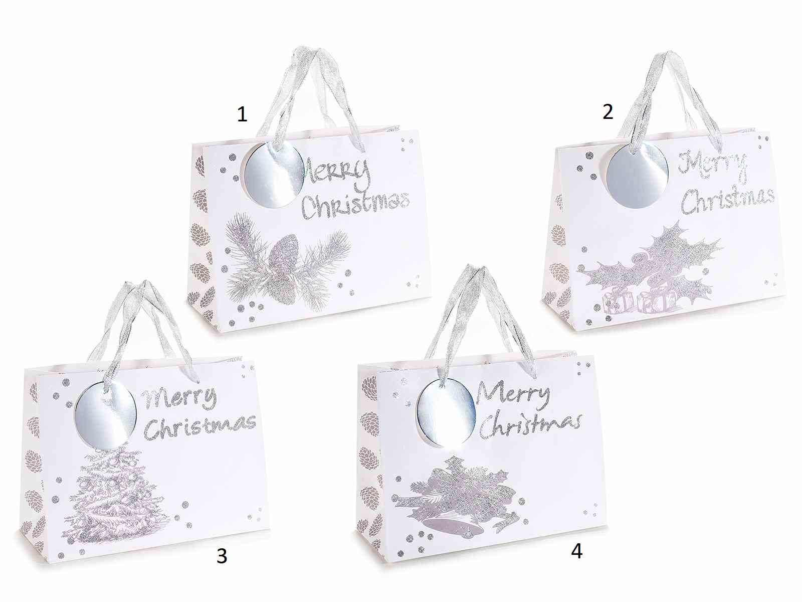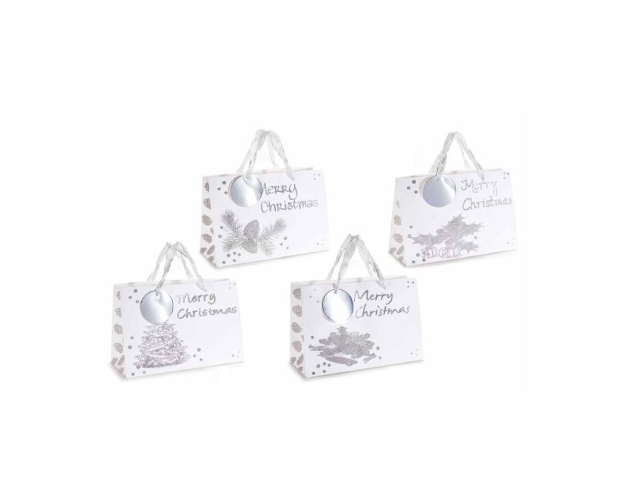 Sacchetto in carta con decoro glitter natalizio, tag e manici argento.