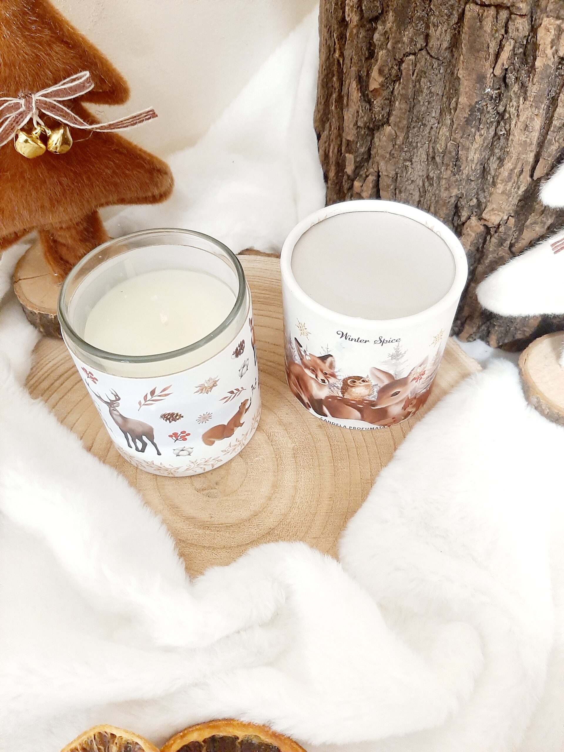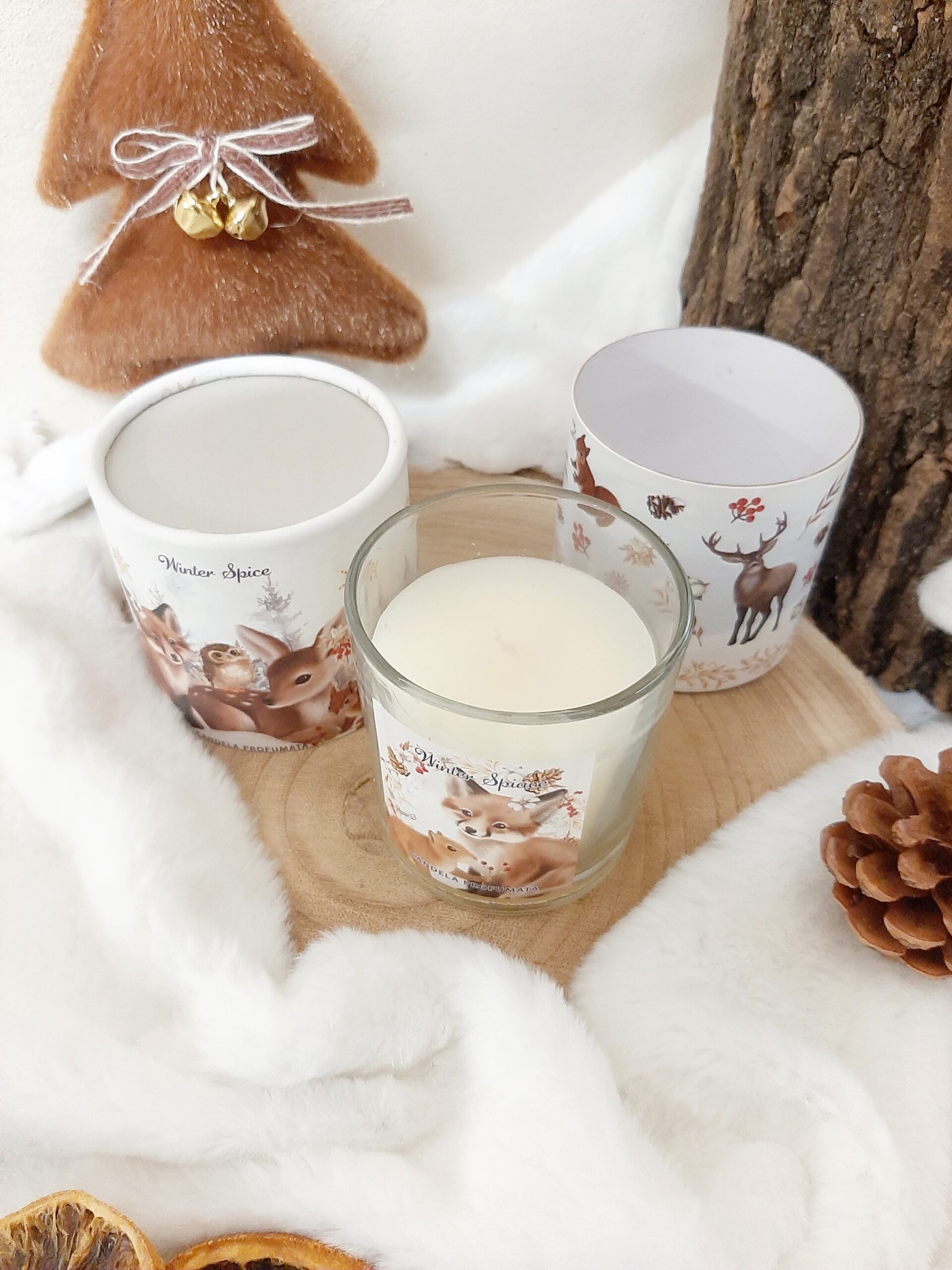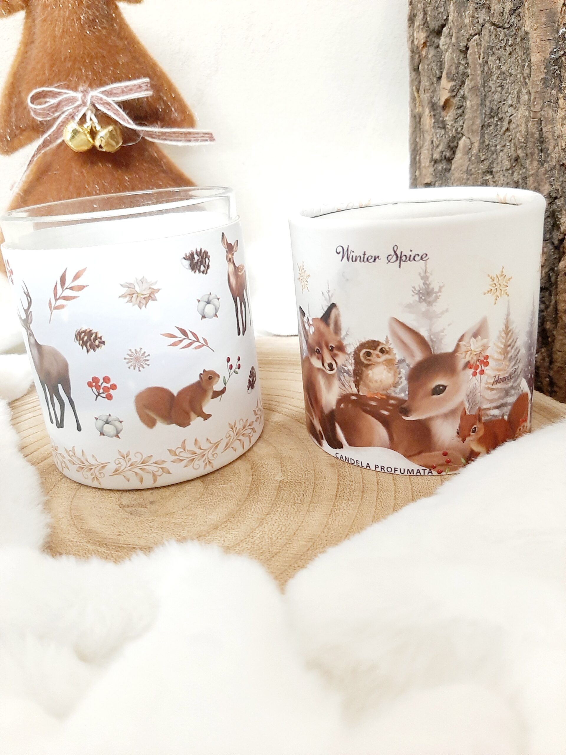 Candela profumate di Natale in vasetto di vetro con stampa animaletti del bosco e confezione regalo cilindrica decorata. Fragranza Winter Spice (spezie invernali), durata 20 ore.