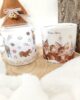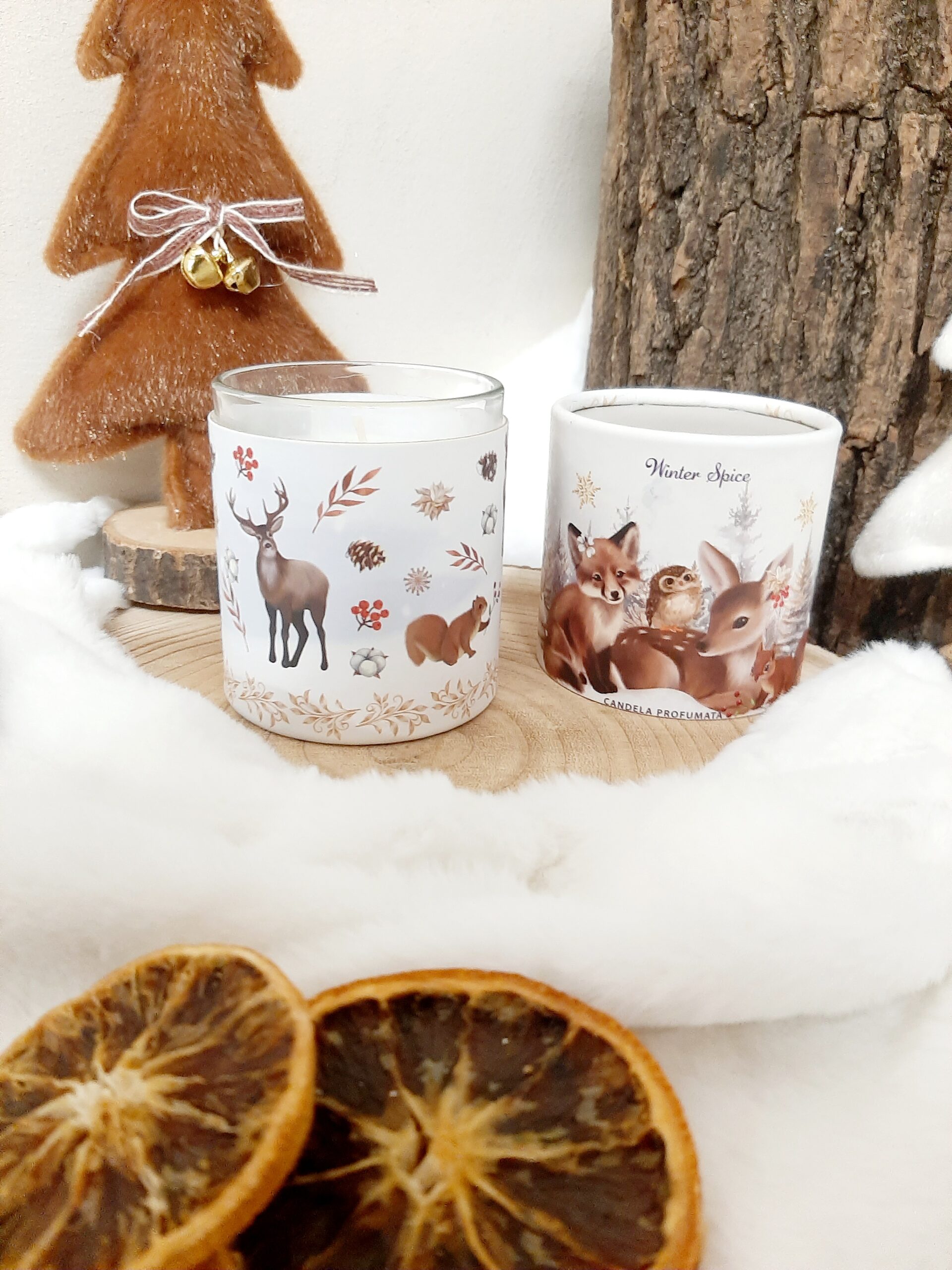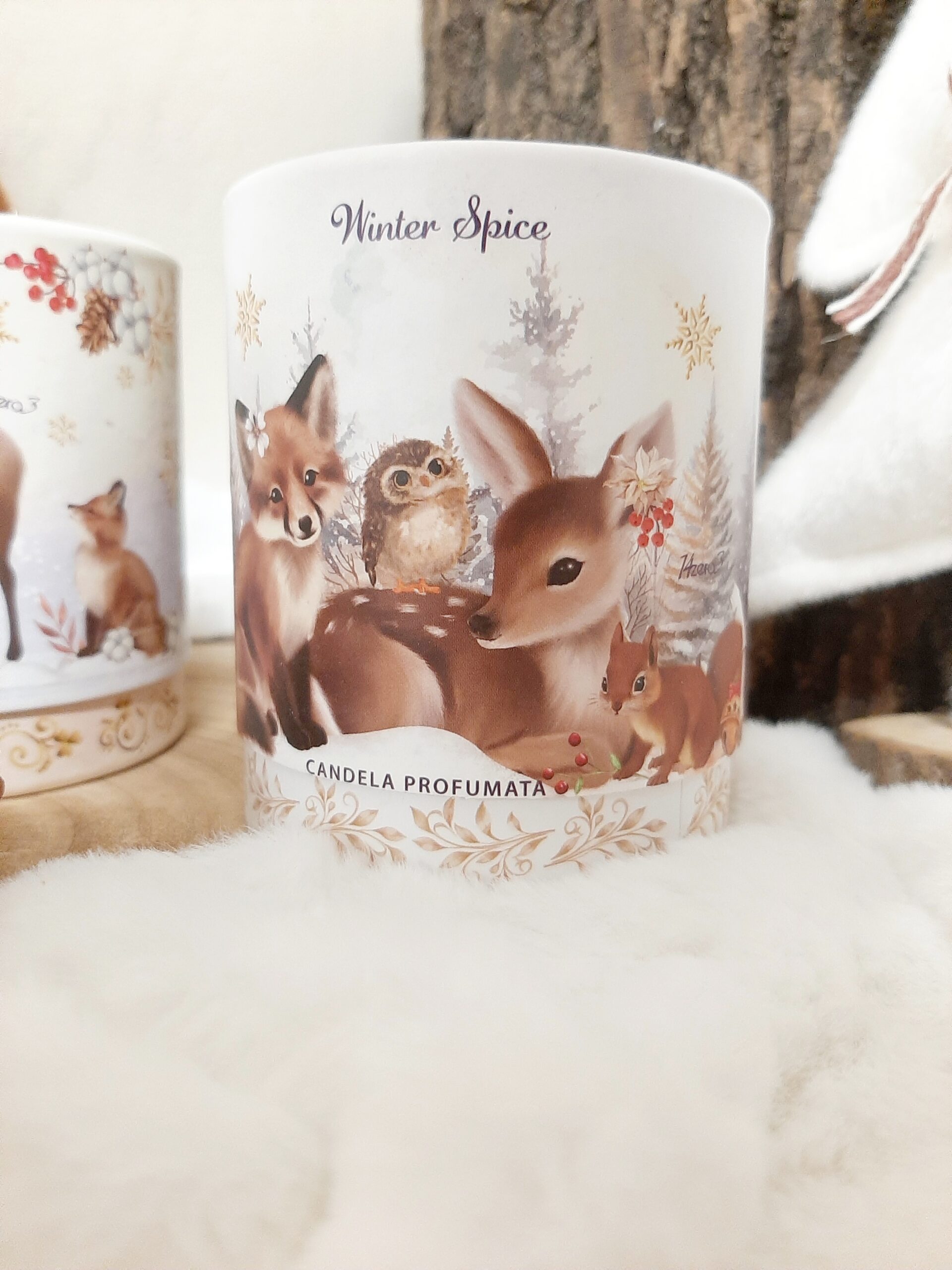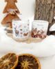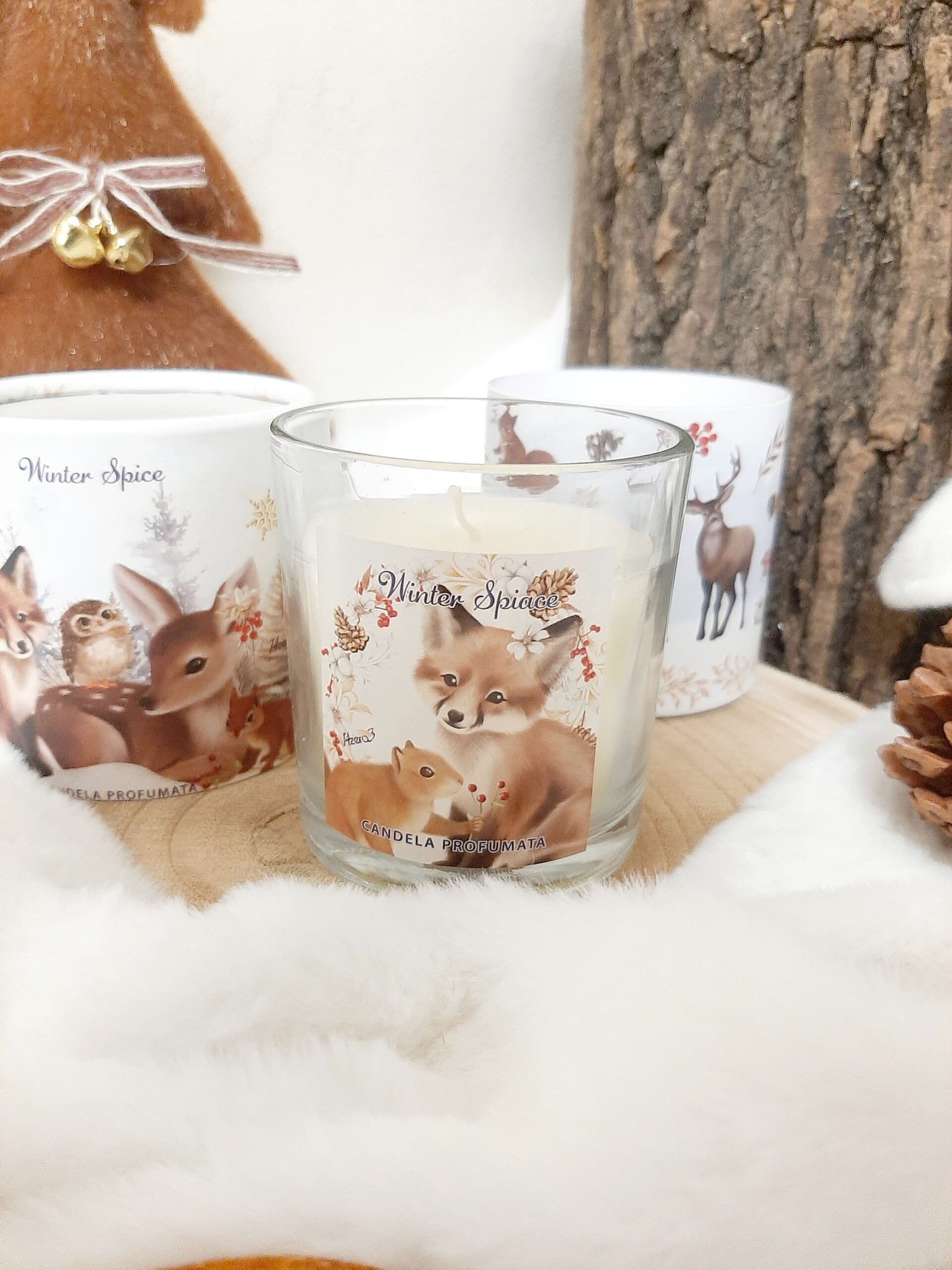 Candela profumate di Natale in vasetto di vetro con stampa animaletti del bosco e confezione regalo cilindrica decorata. Fragranza Winter Spice (spezie invernali), durata 20 ore.