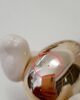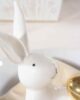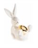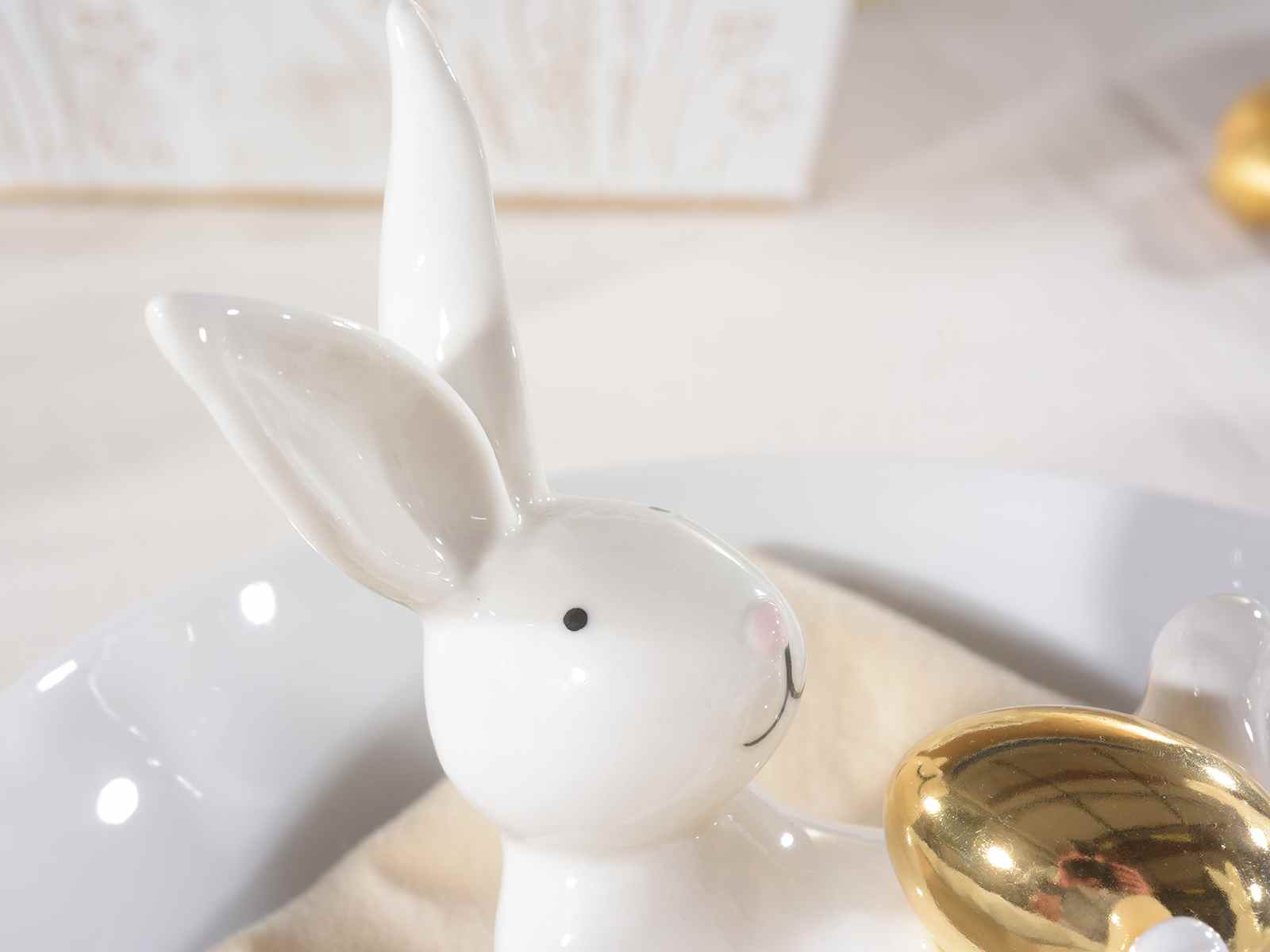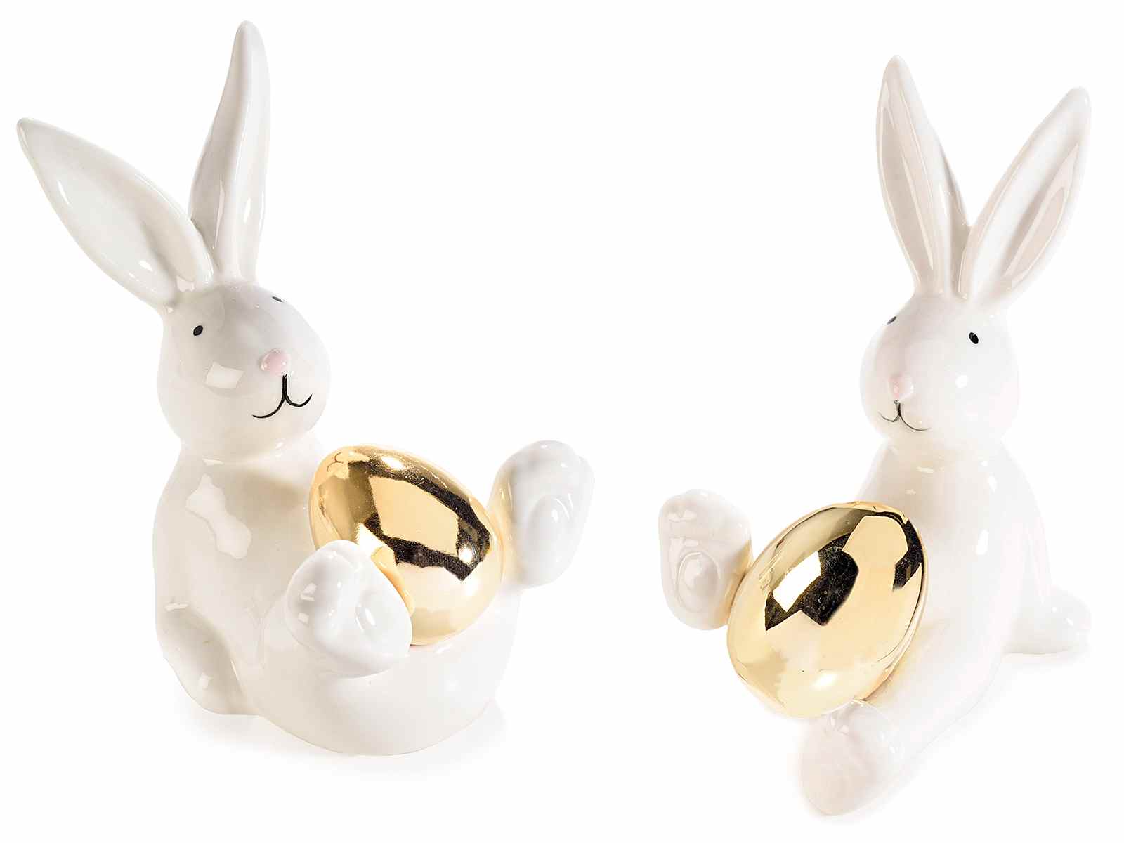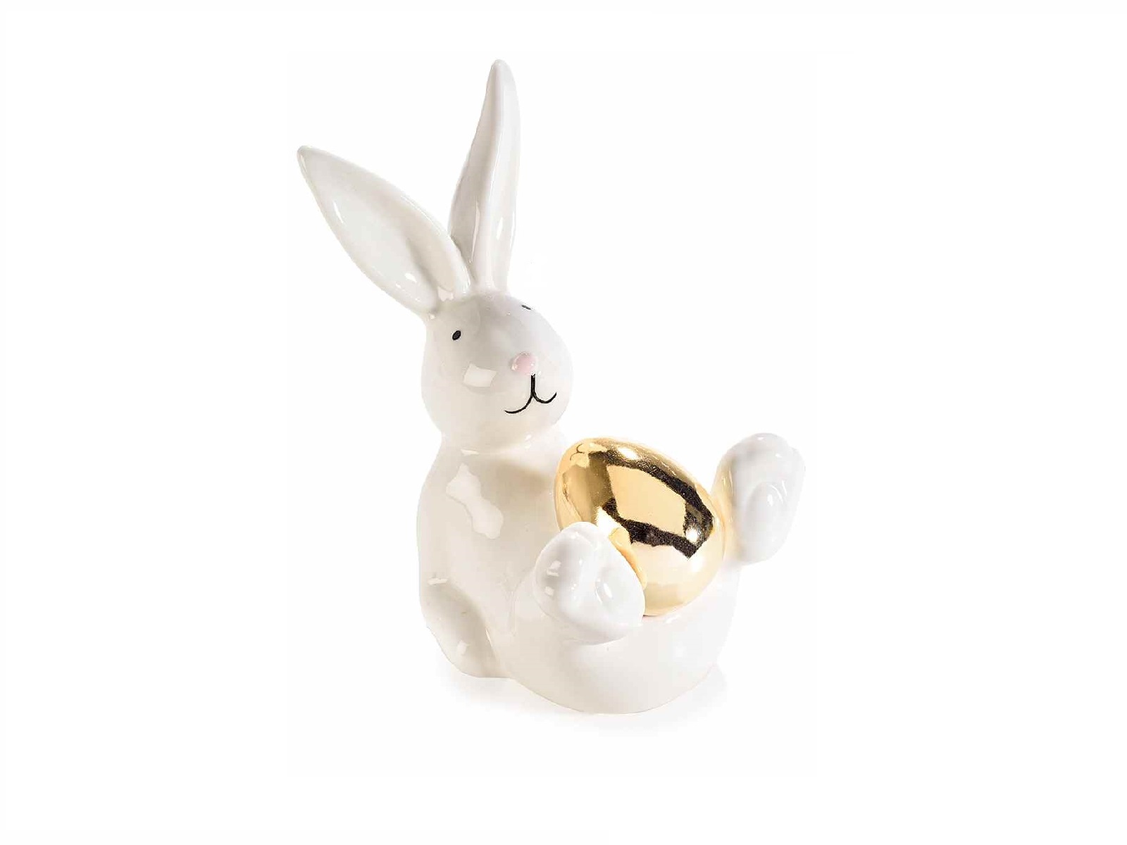Coniglietto pasquale decorativo sdraiato in ceramica con uovo simil oro lucido.