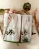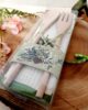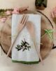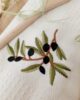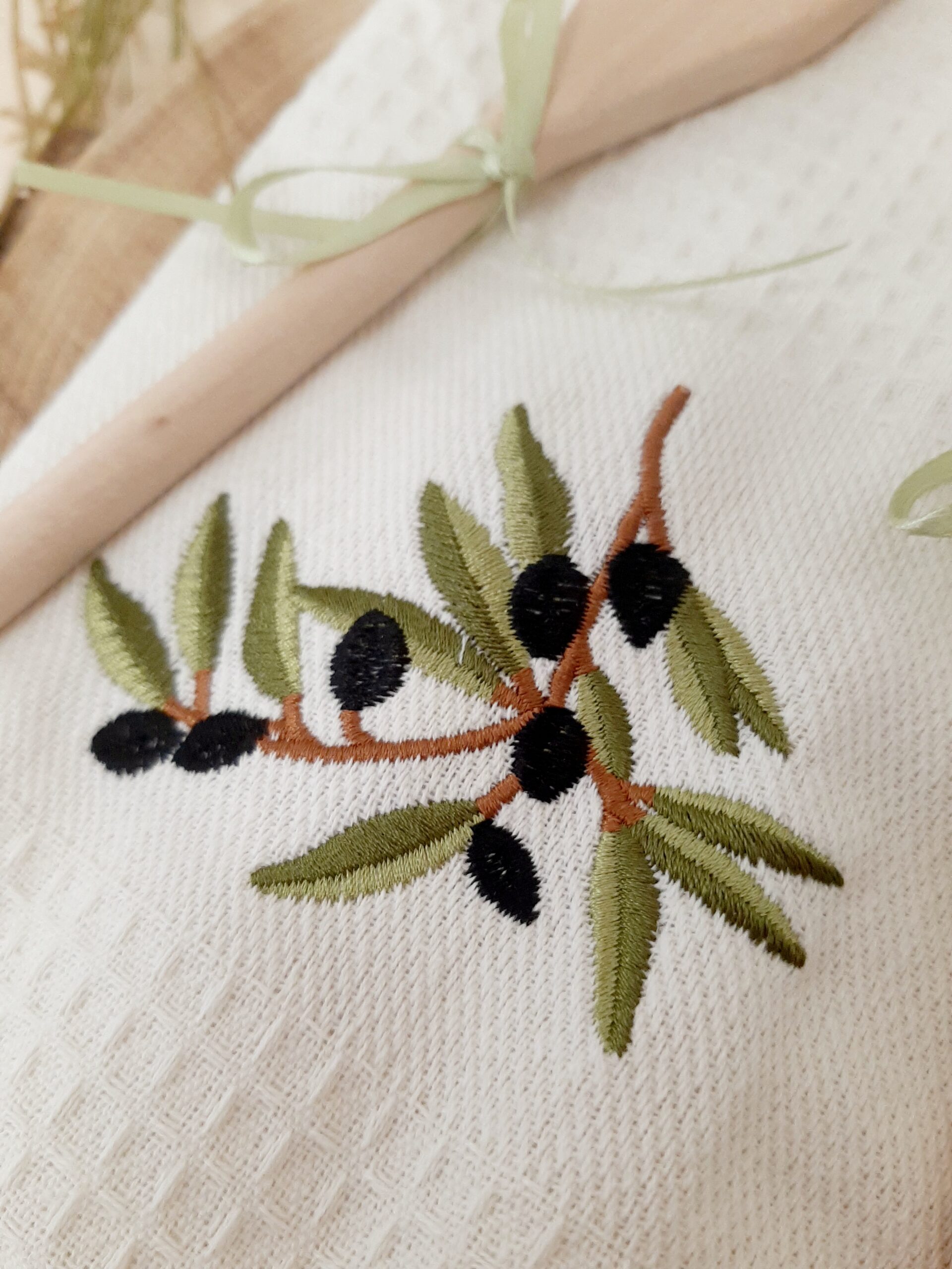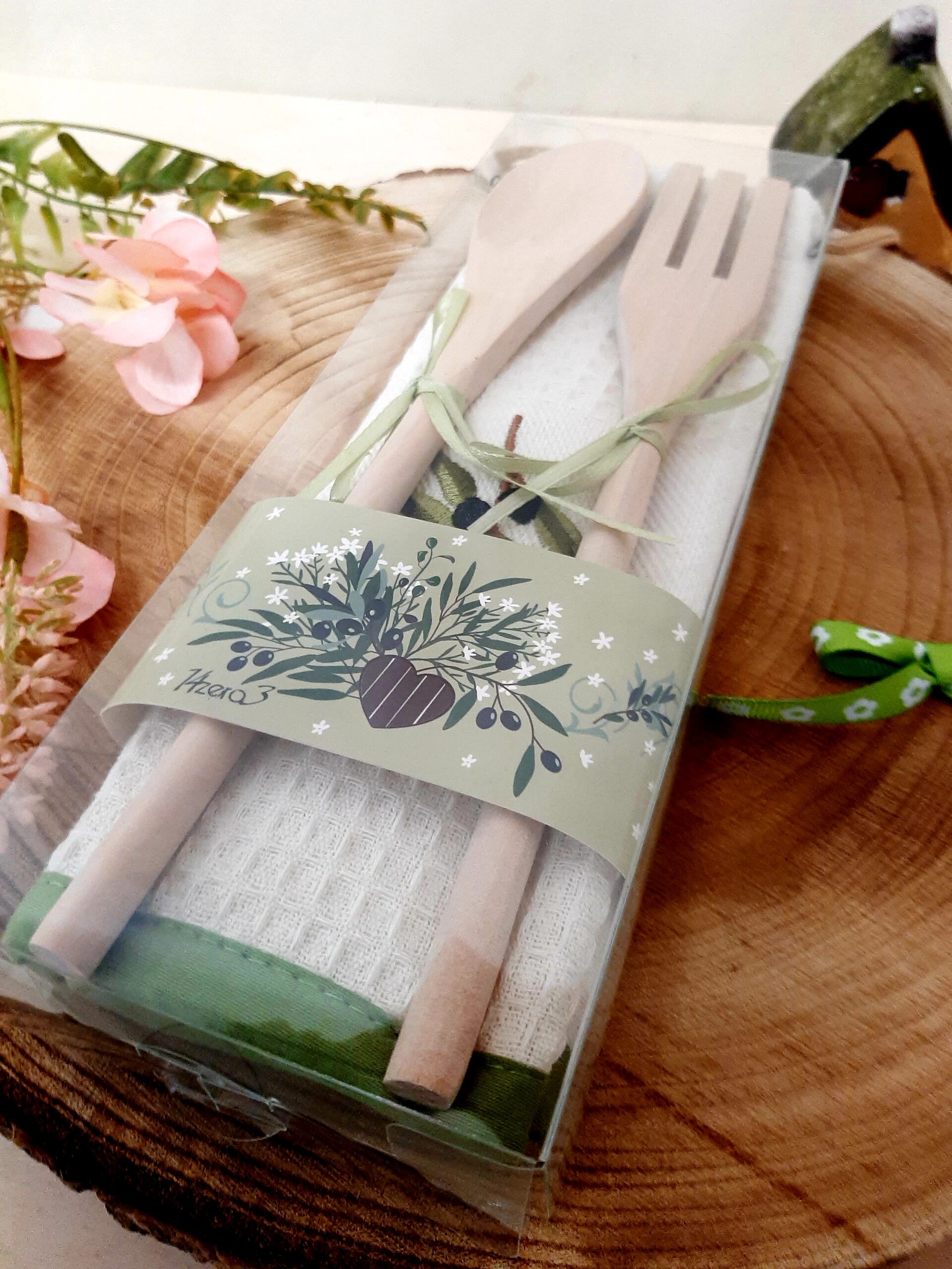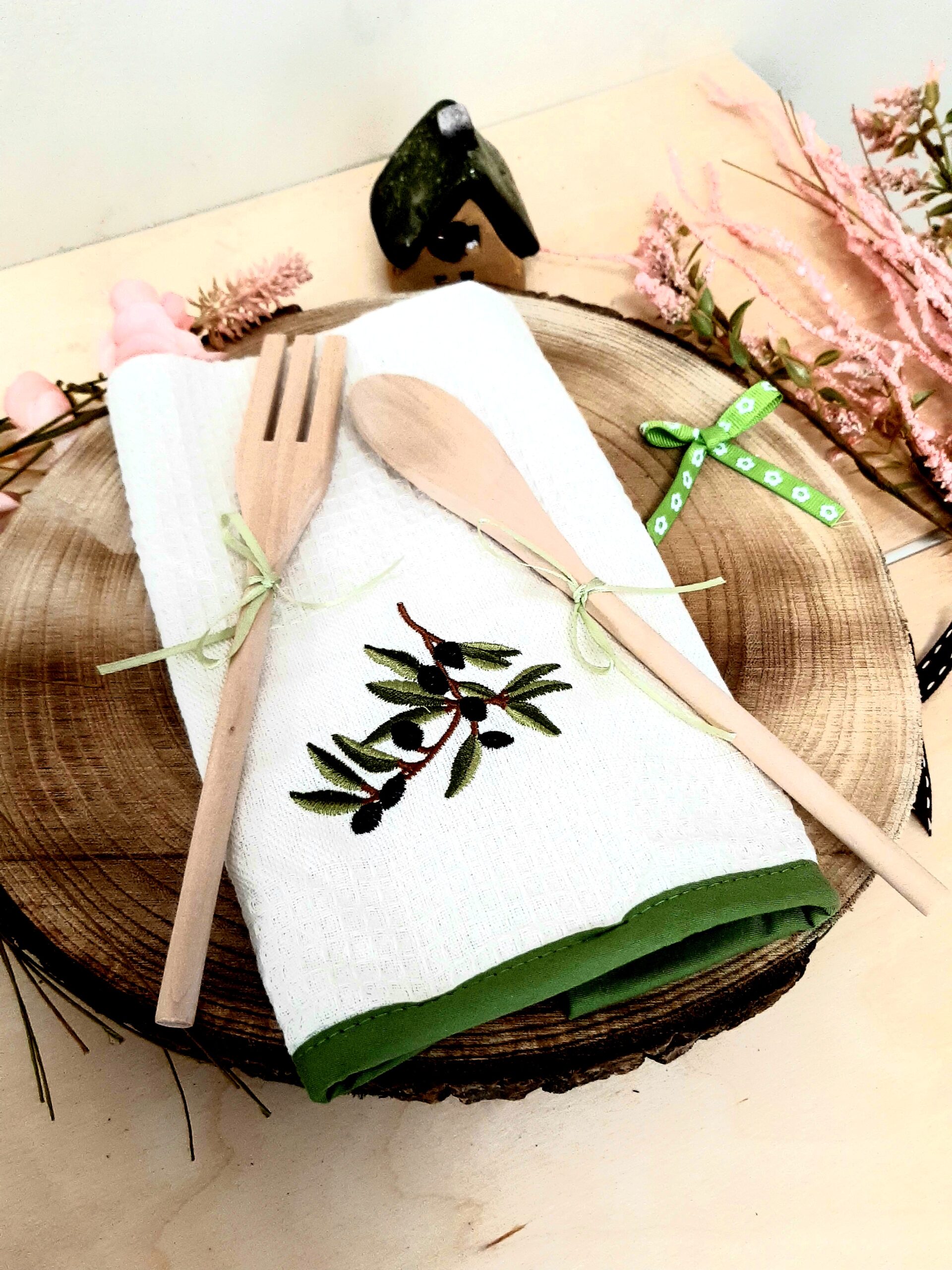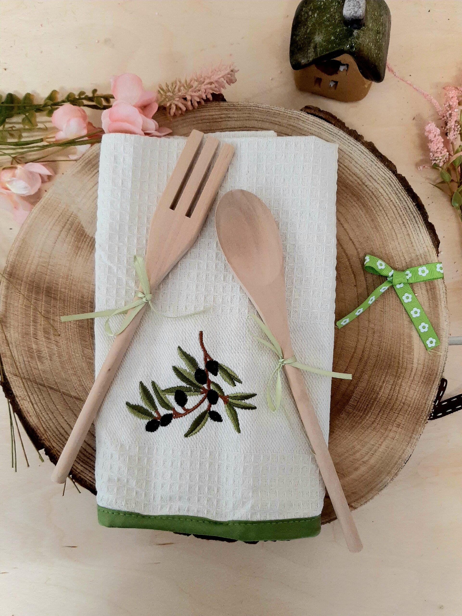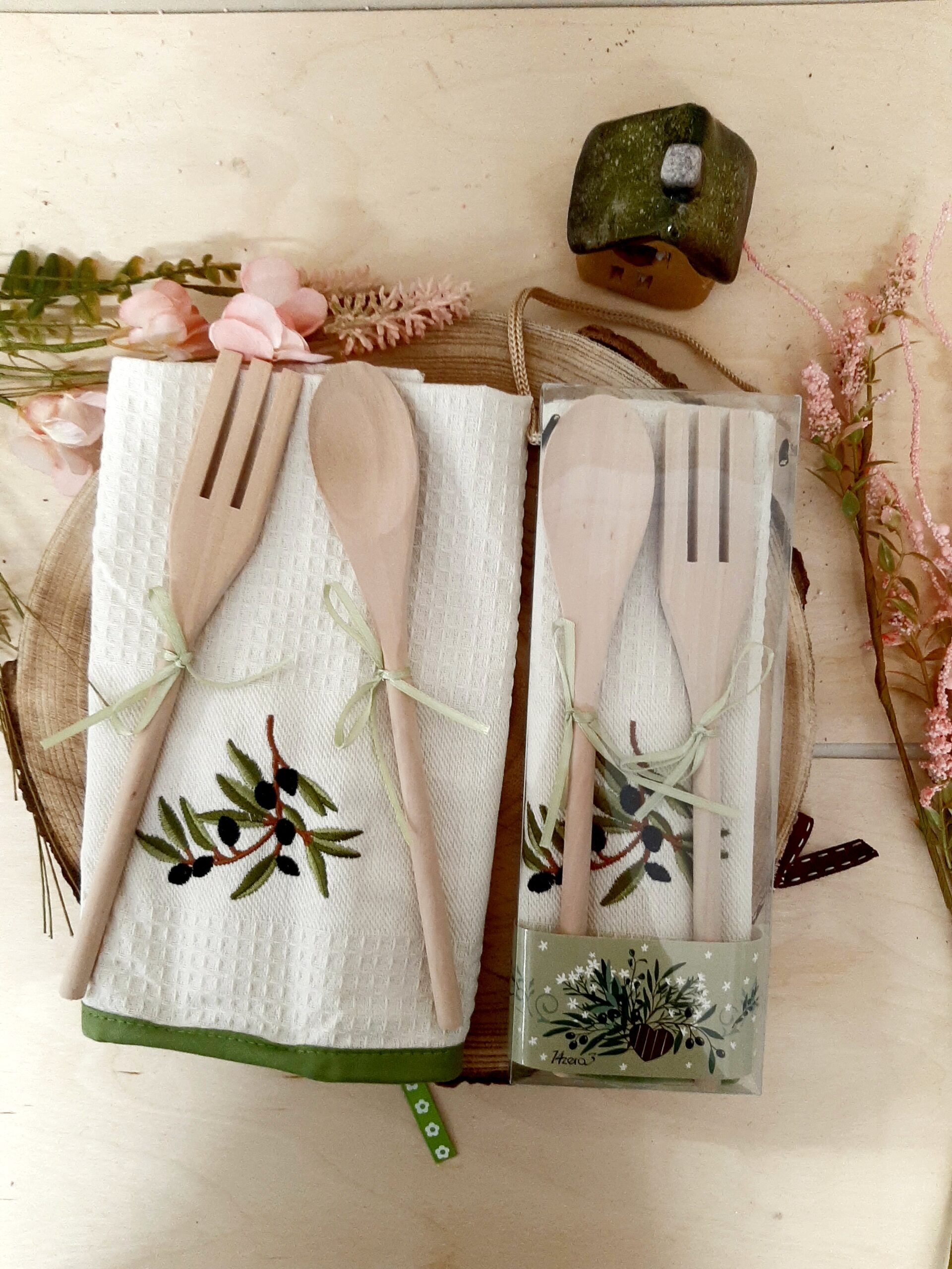 Set composto da asciugapiatti in cotone con ricamo decoro olive e coppia posate in legno, mestolo e forchetta, in confezione regalo.