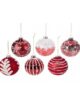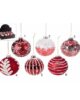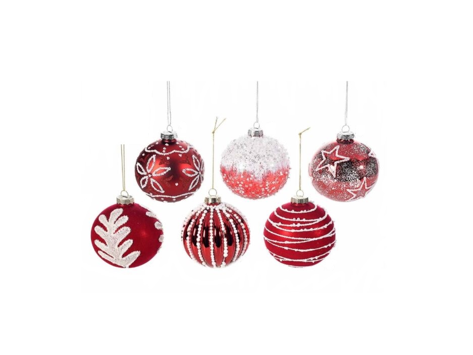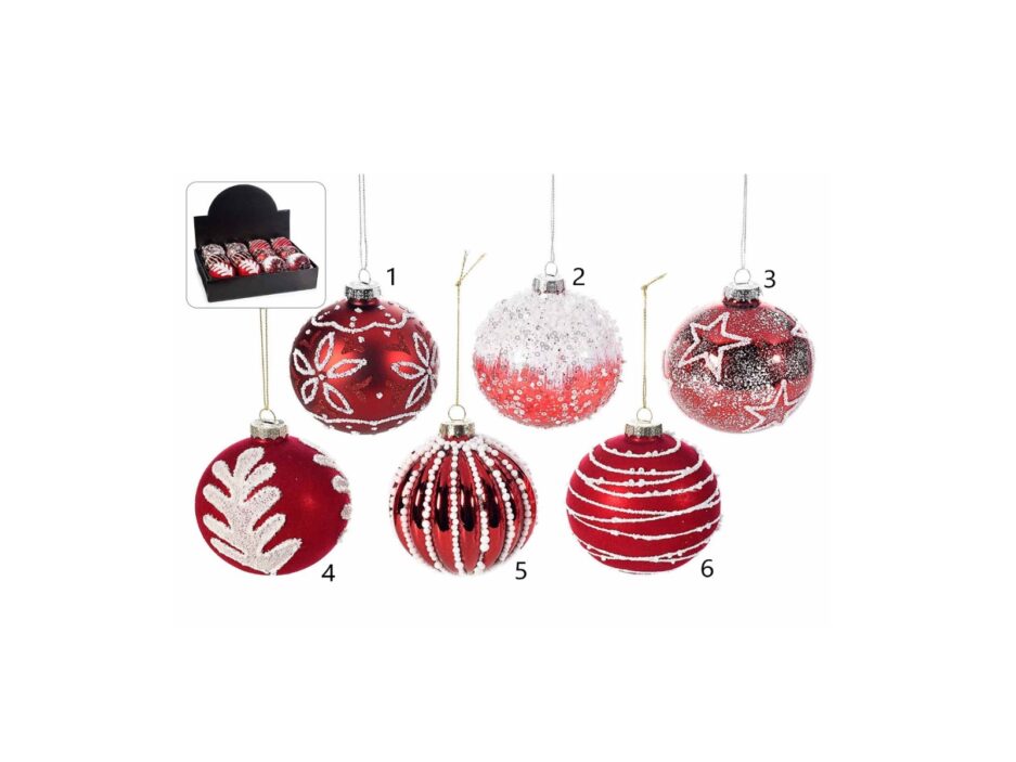 Palline in vetro colorato rosse con decori in glitter e velluto.