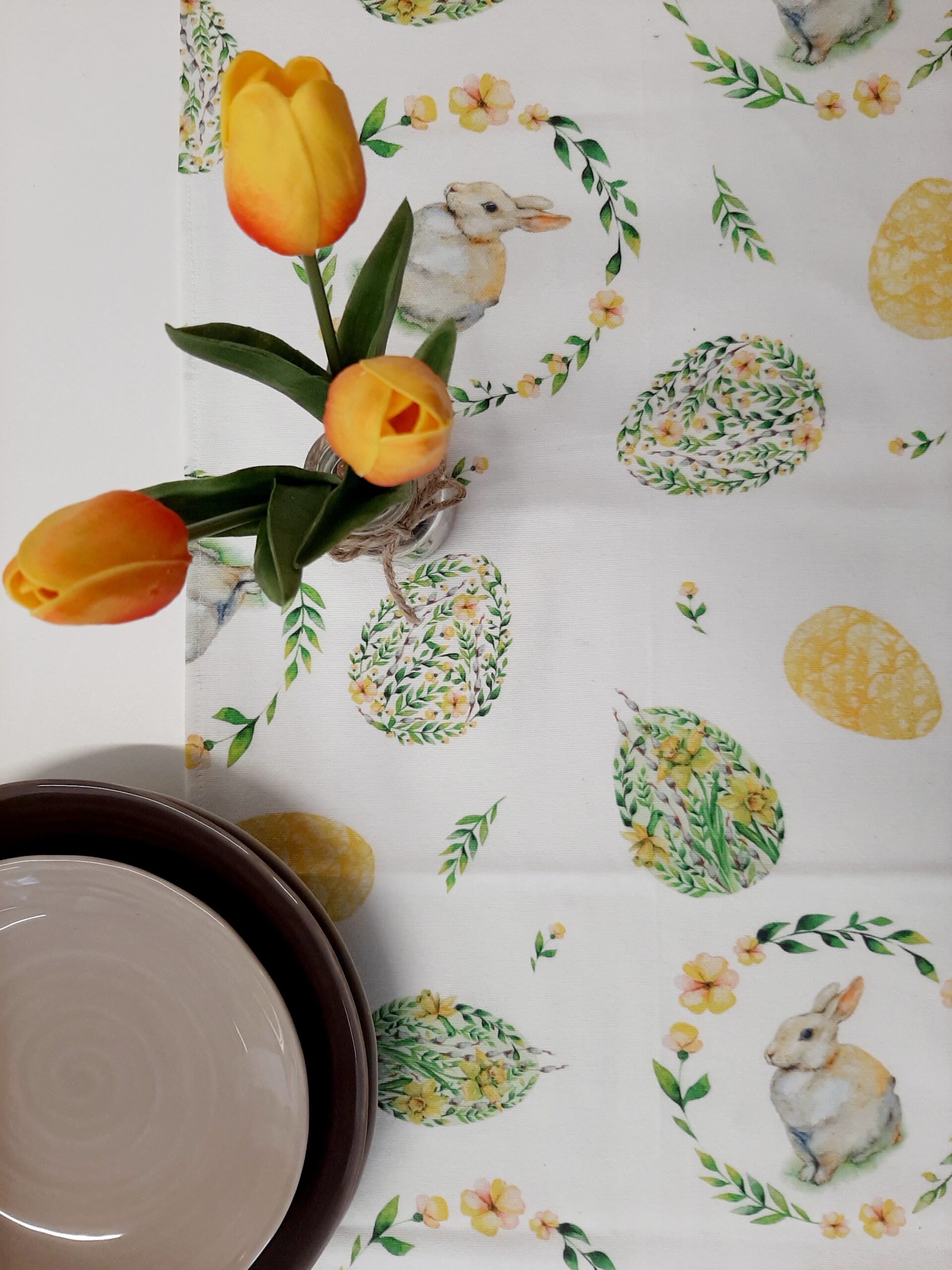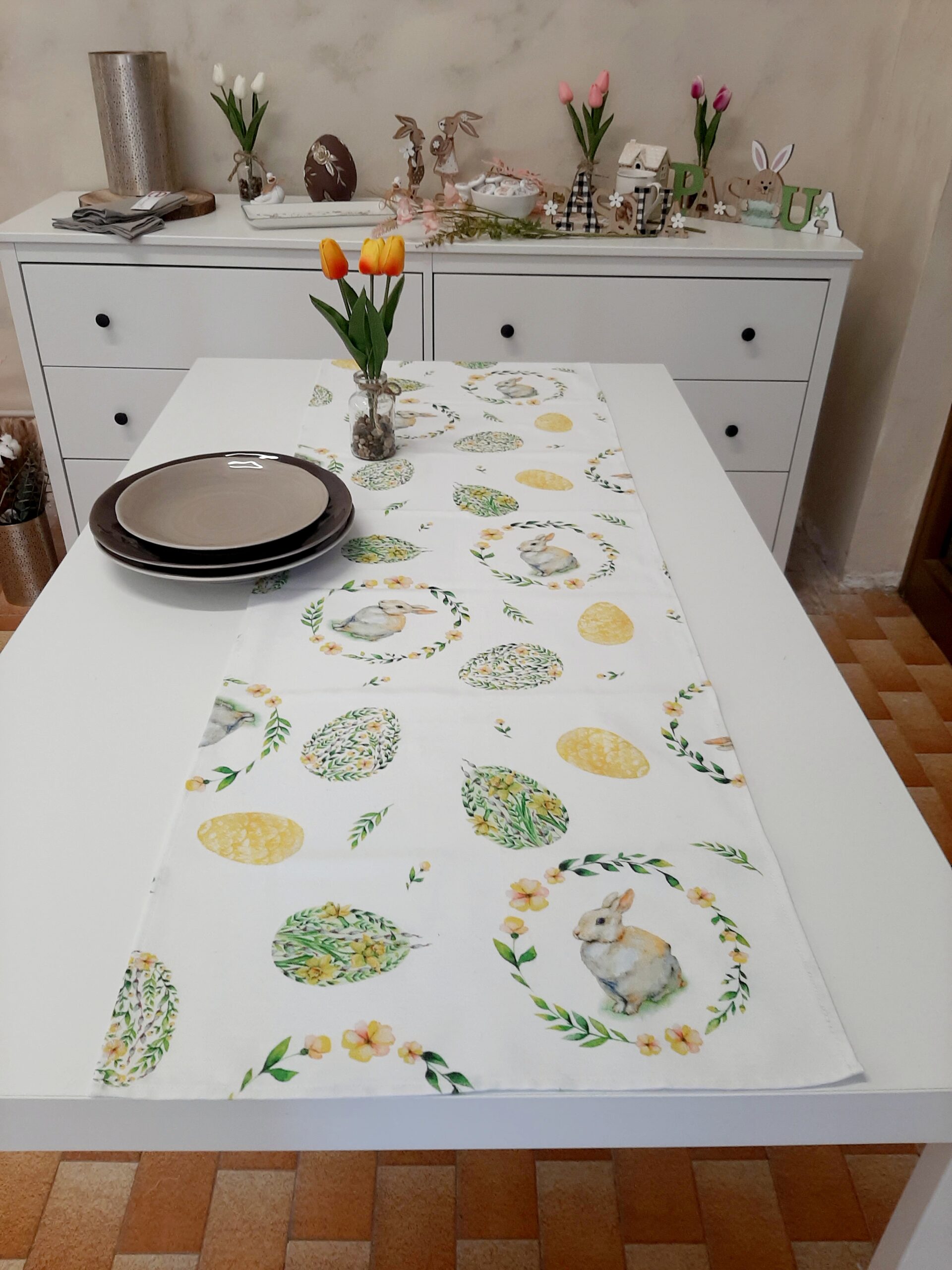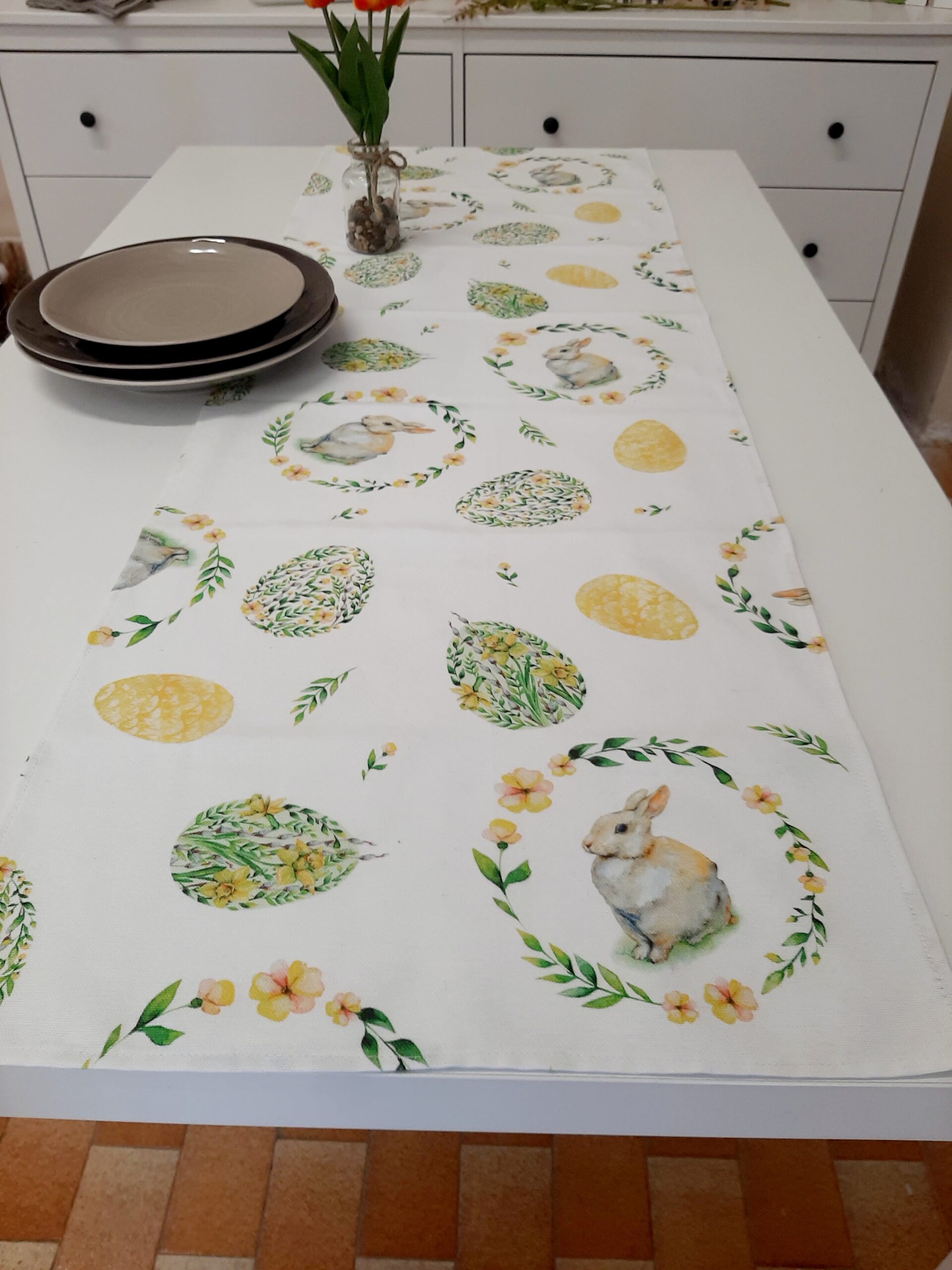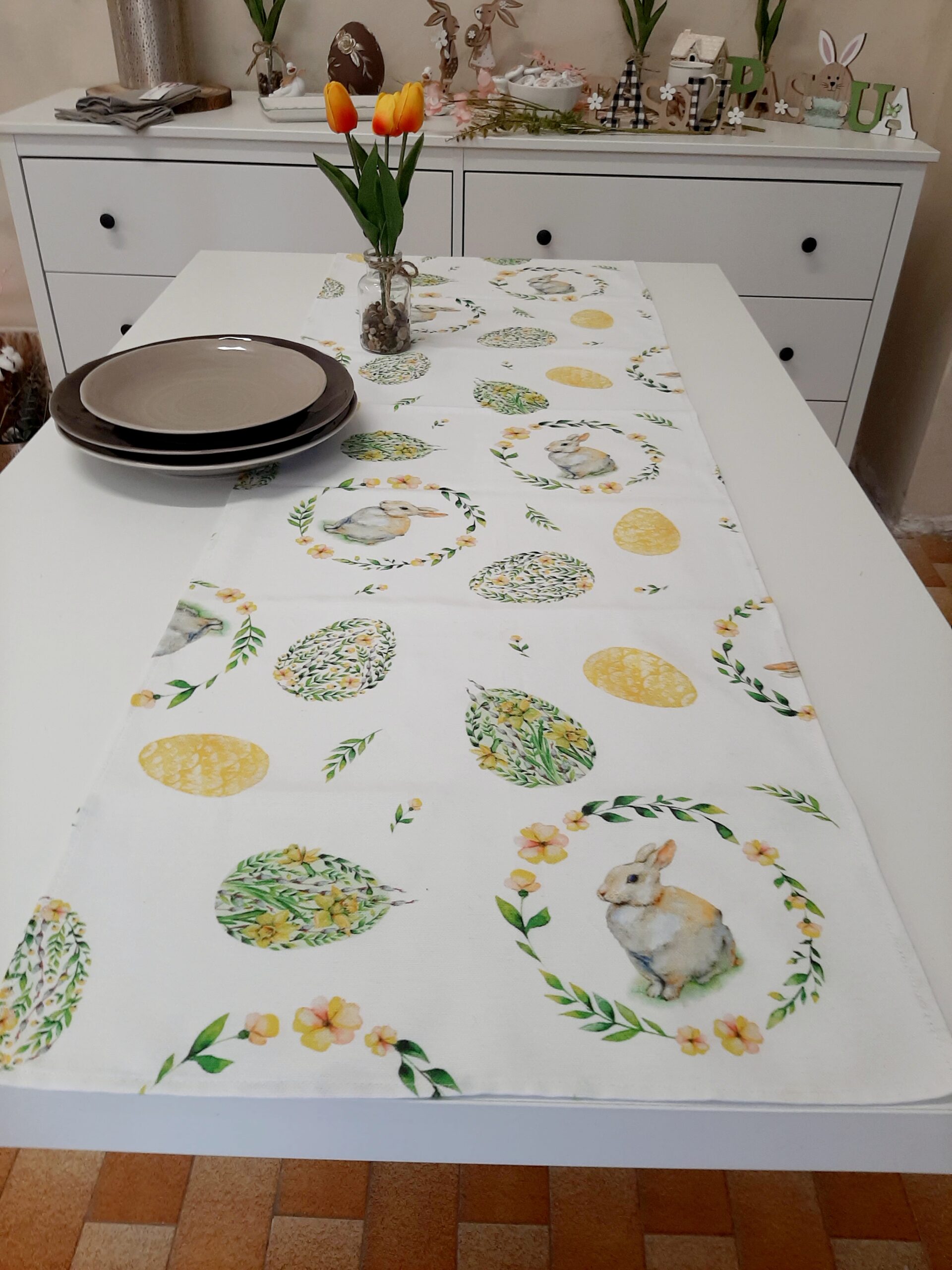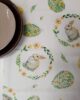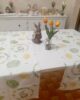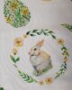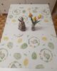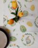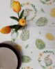 Runner pasquale in tessuto 100% cotone con stampa coniglietti e uova floreali, nei delicati colori pastello verde e giallo.