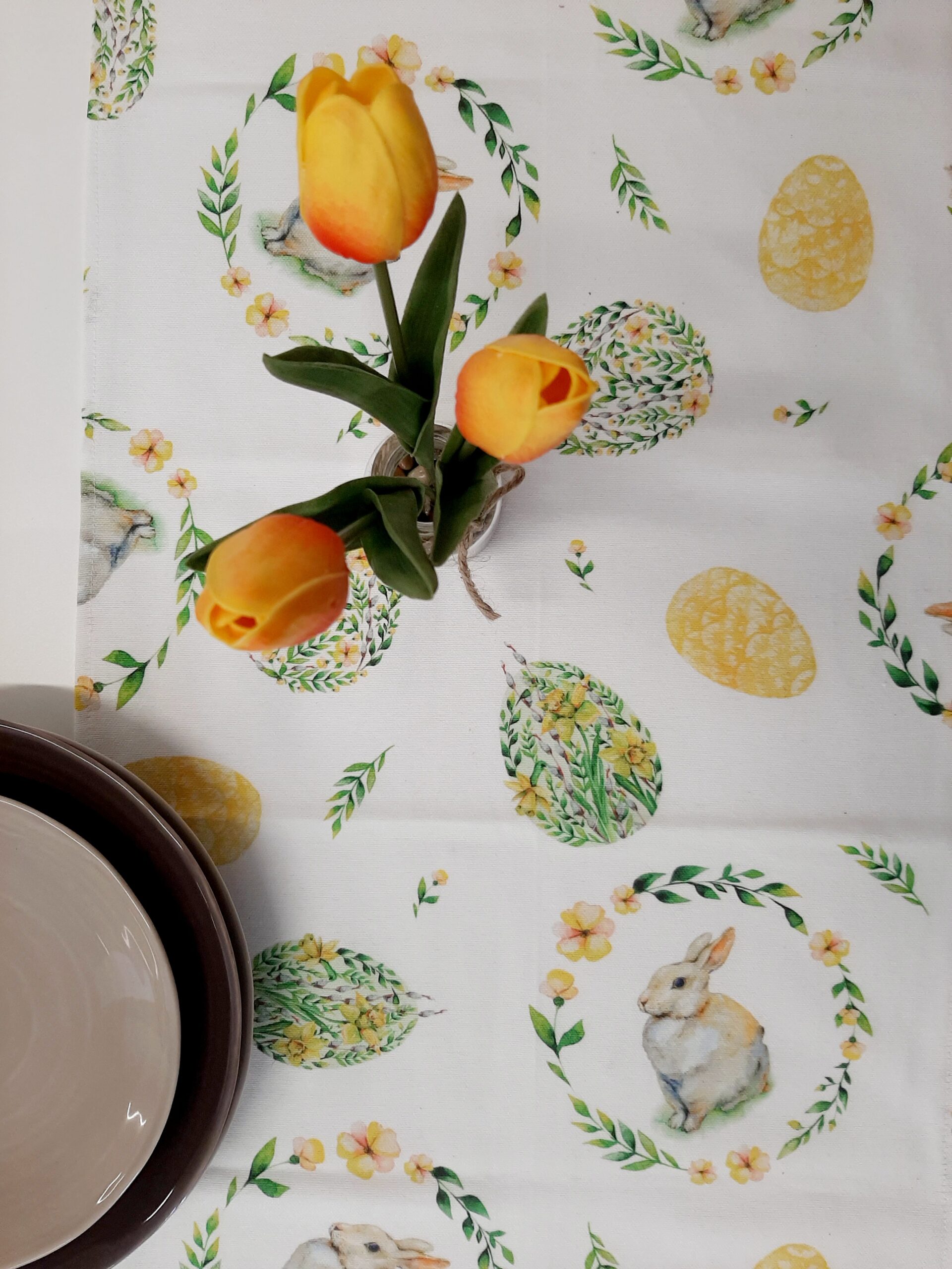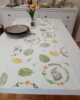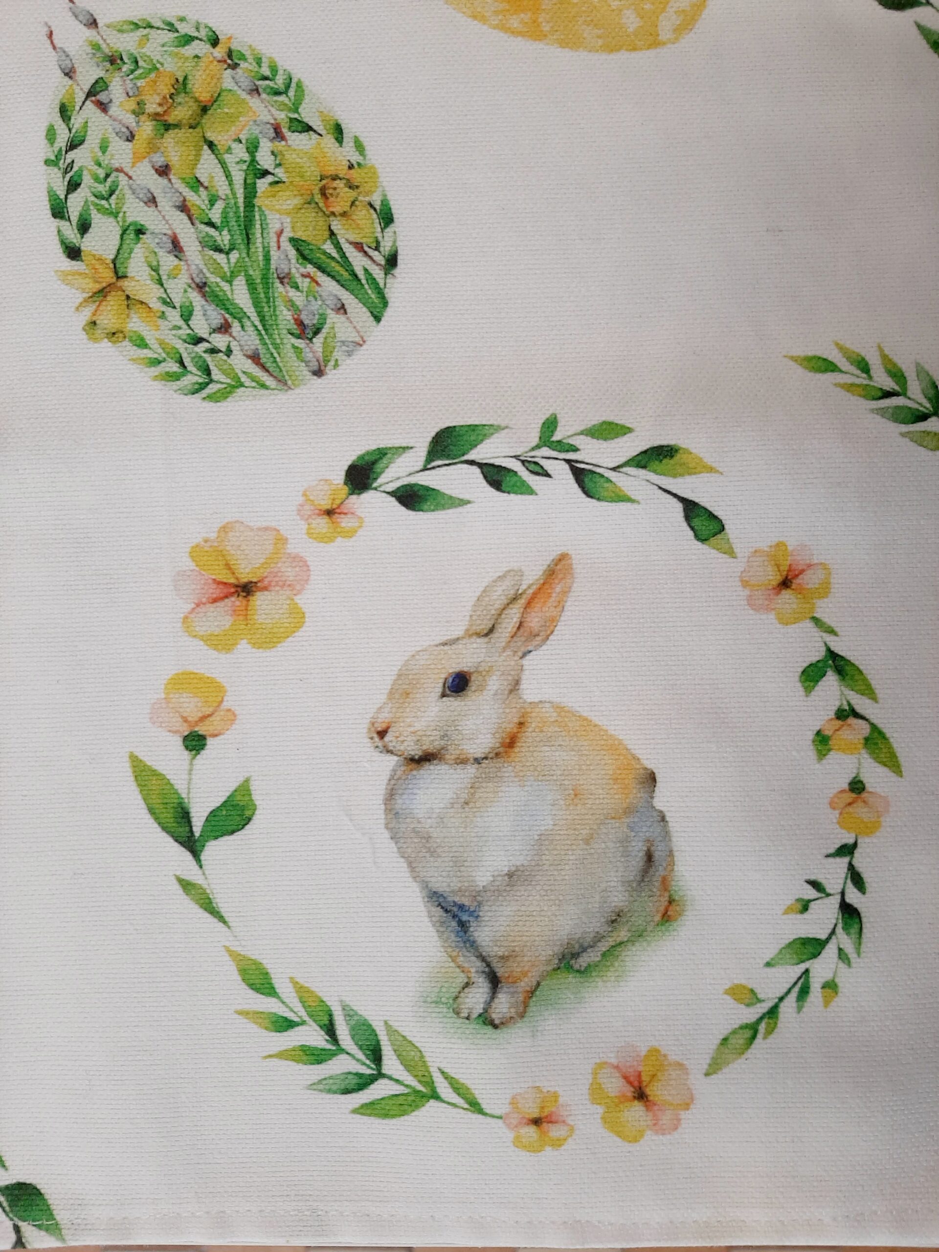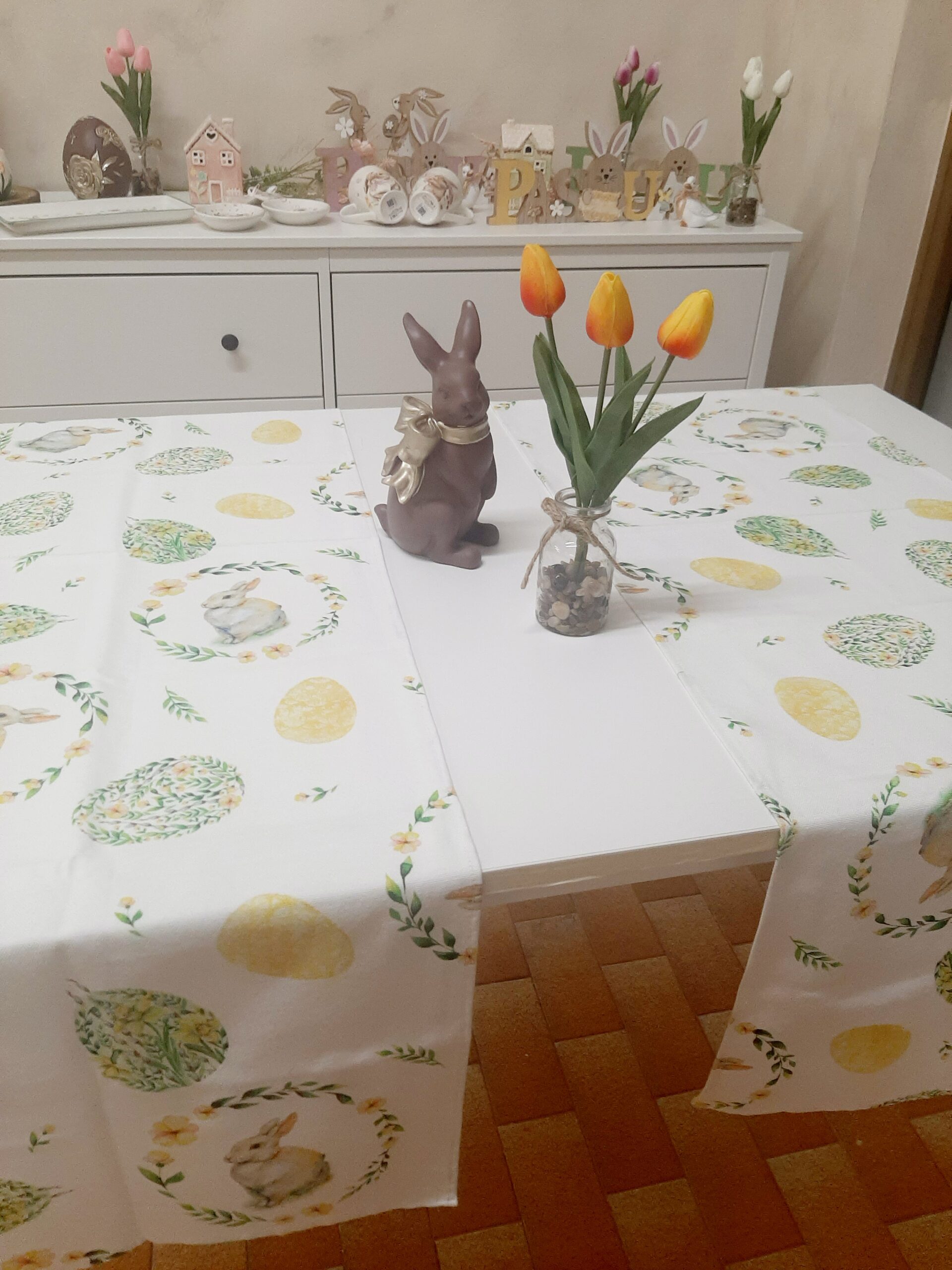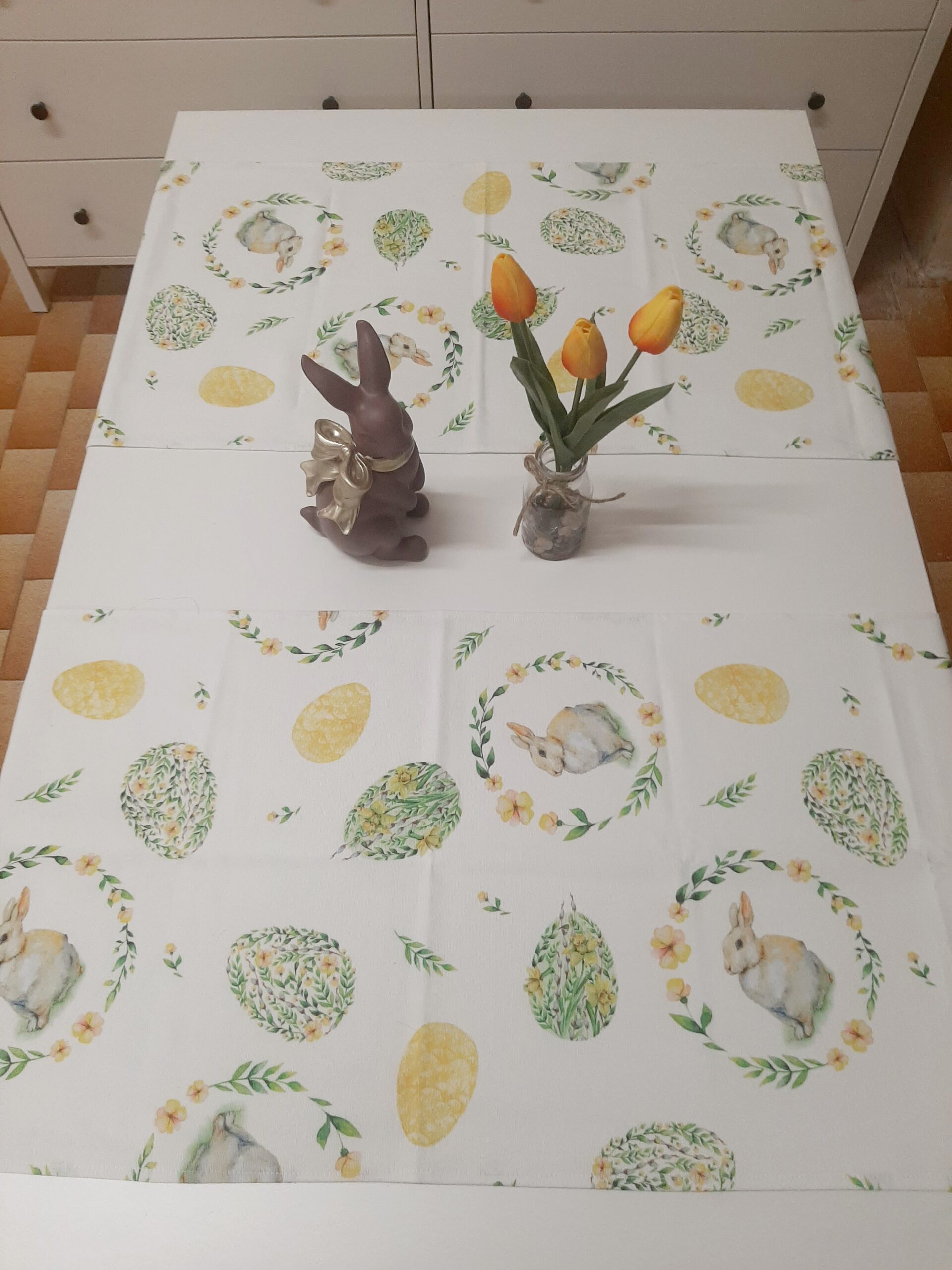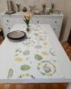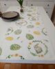 Runner pasquale in tessuto 100% cotone con stampa coniglietti e uova floreali, nei delicati colori pastello verde e giallo.