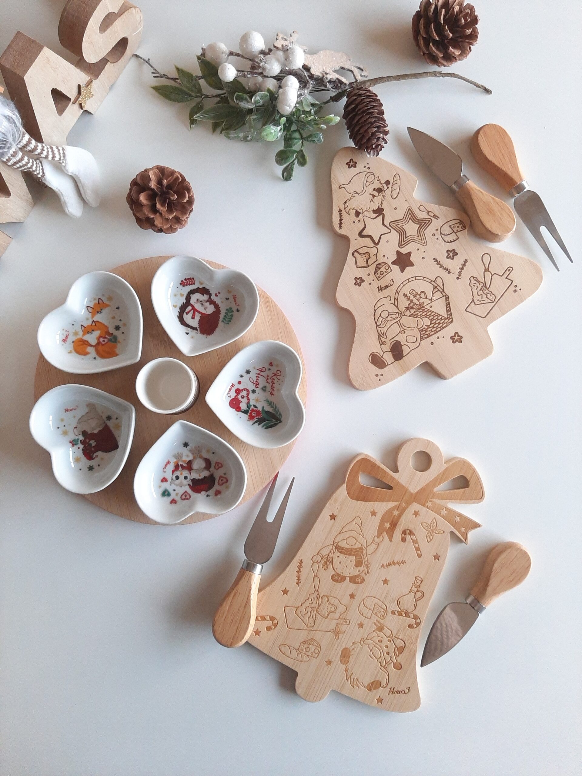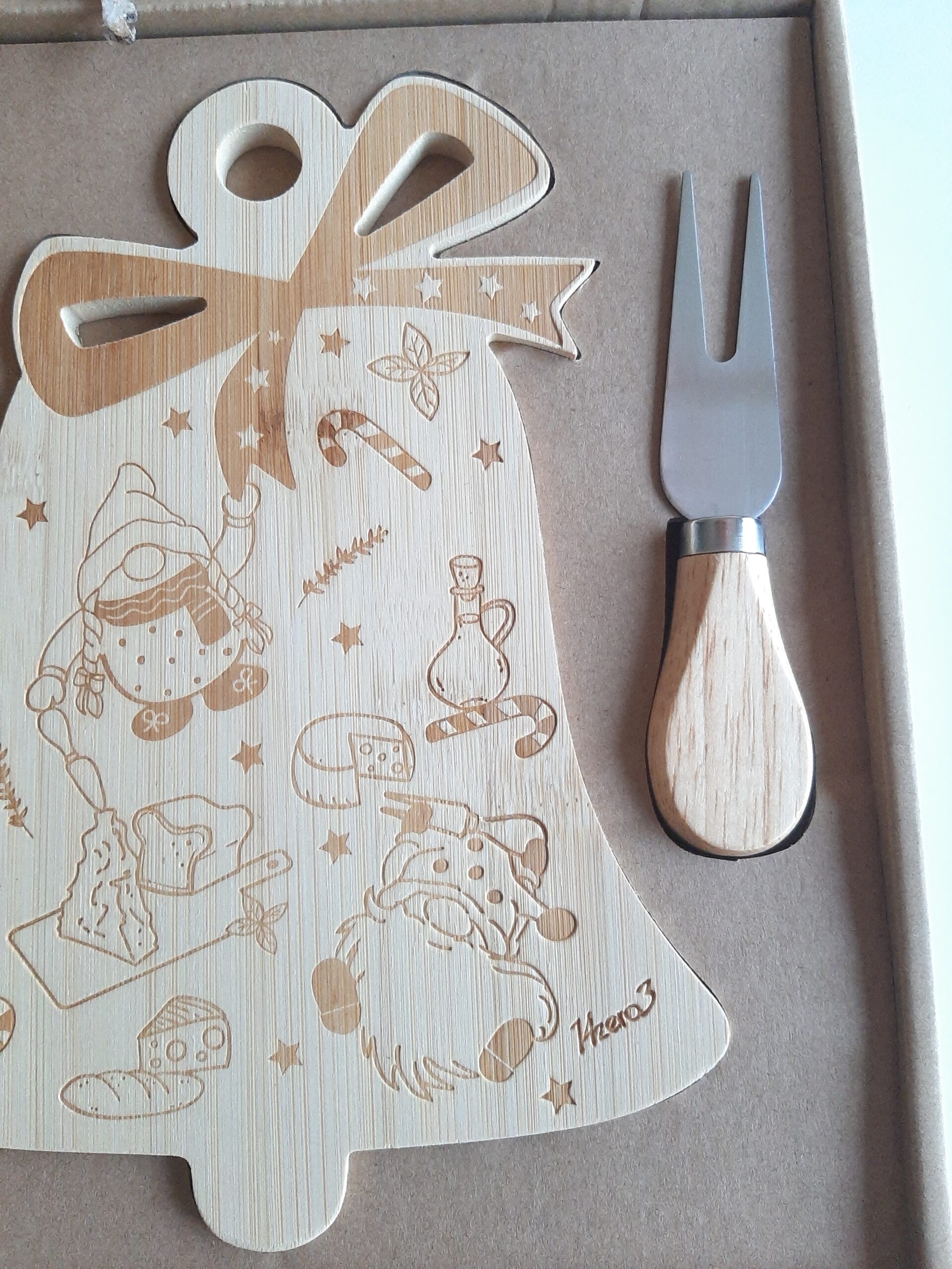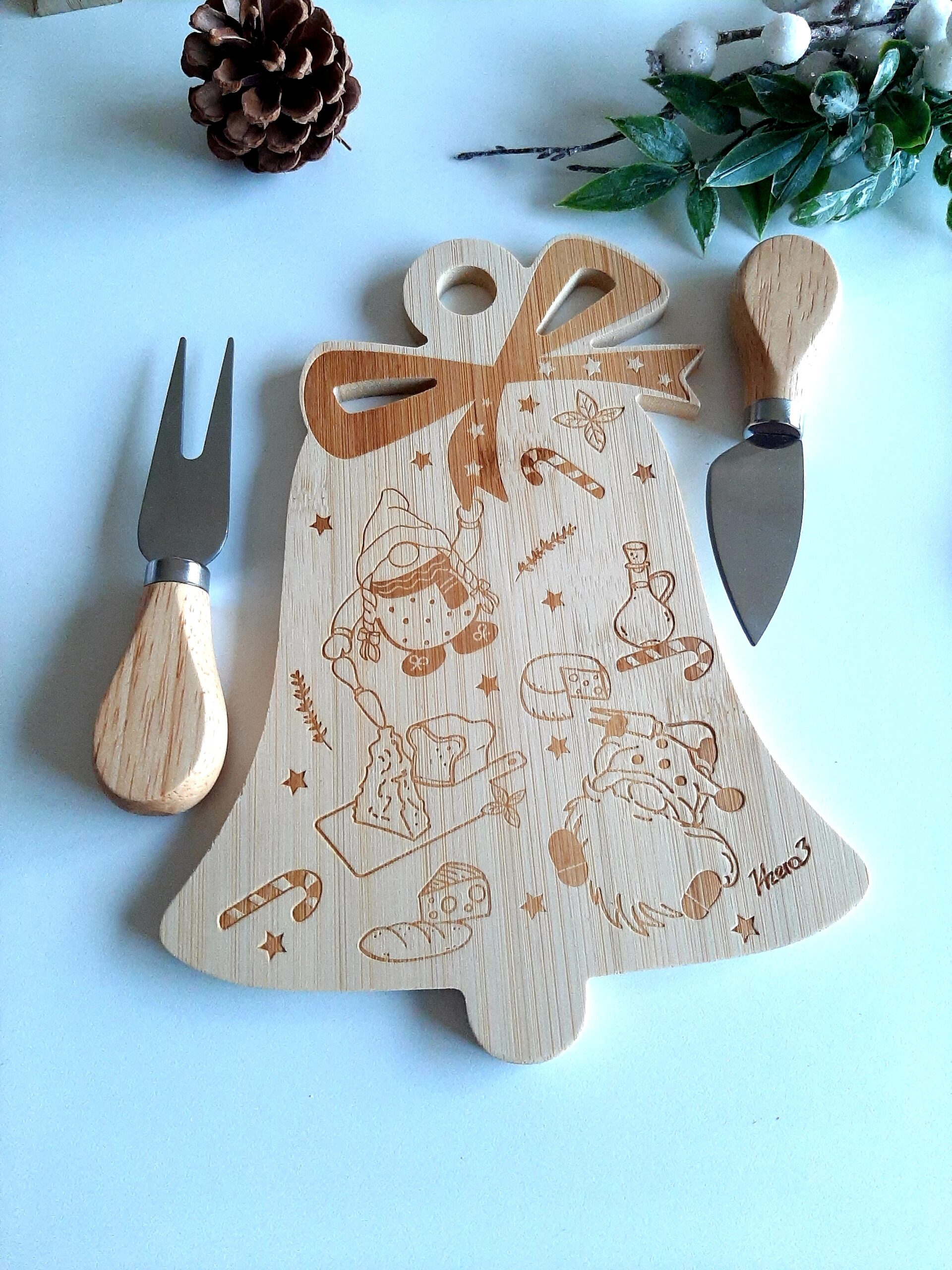Set aperitivo composto da tagliere in legno decoro gnometti e 2 coltelli formaggio, confezionato in scatola con coperchio trasparente.
