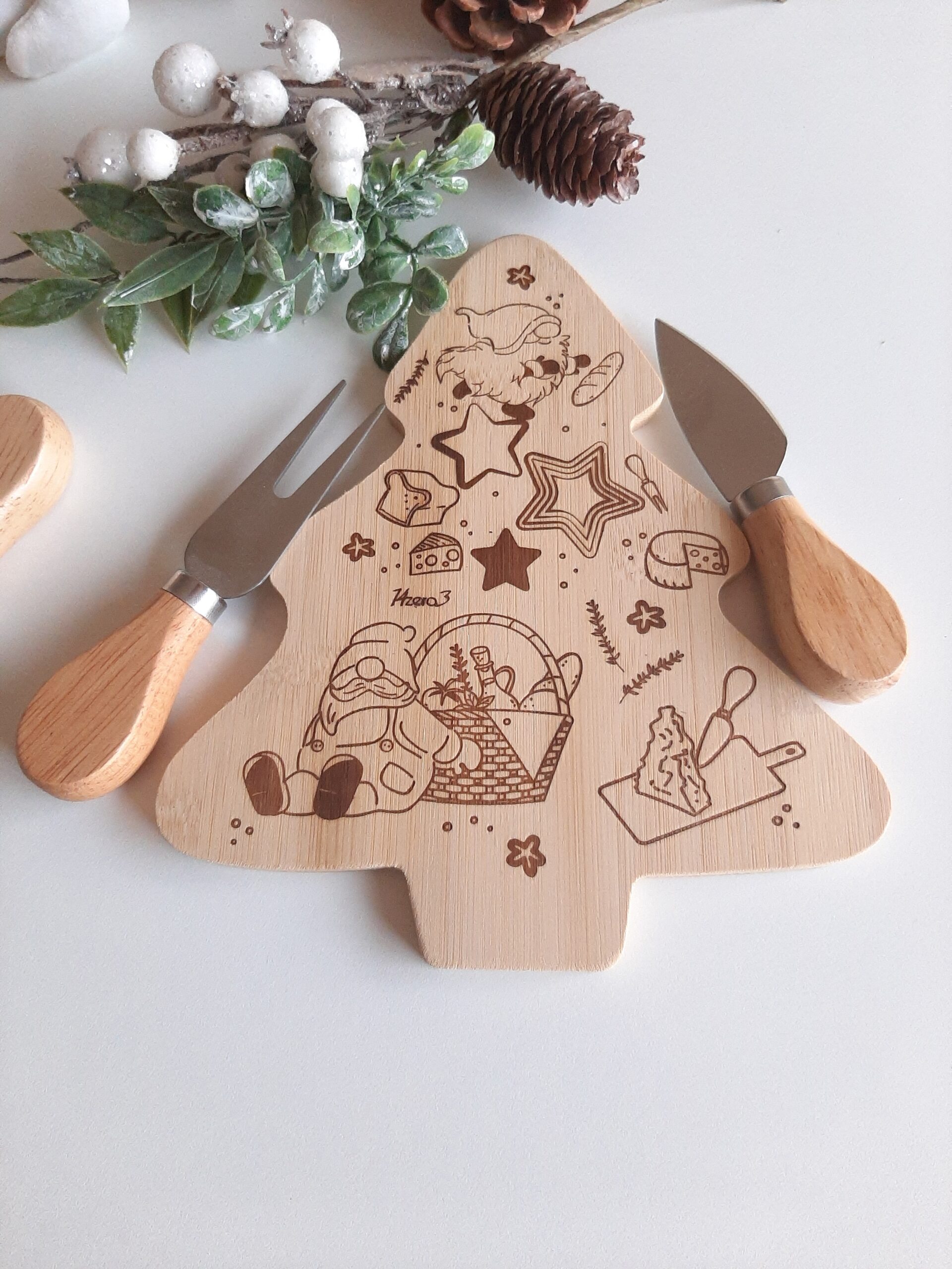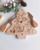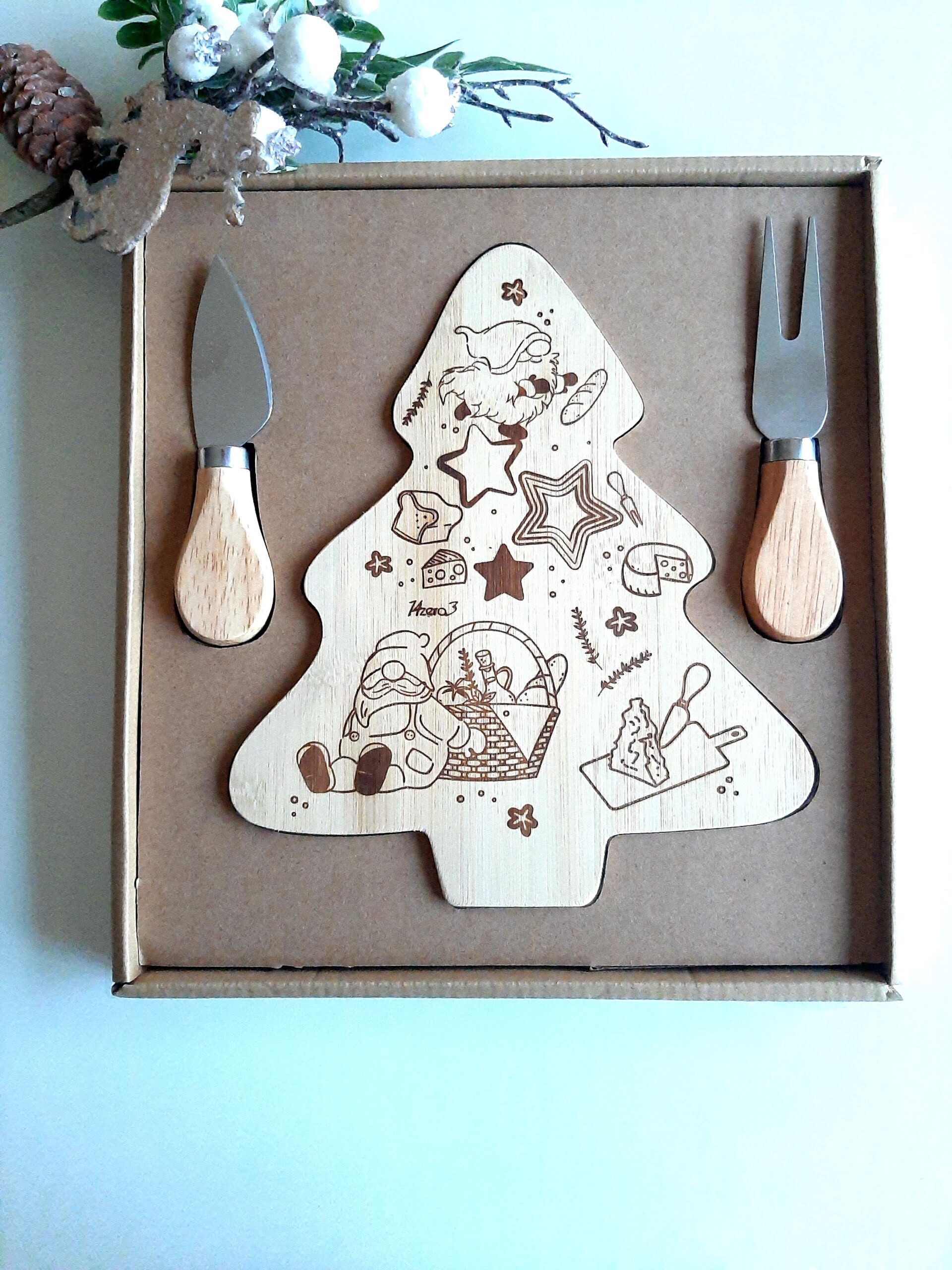 Set aperitivo composto da tagliere in legno decoro gnometti e 2 coltelli formaggio, confezionato in scatola con coperchio trasparente.