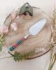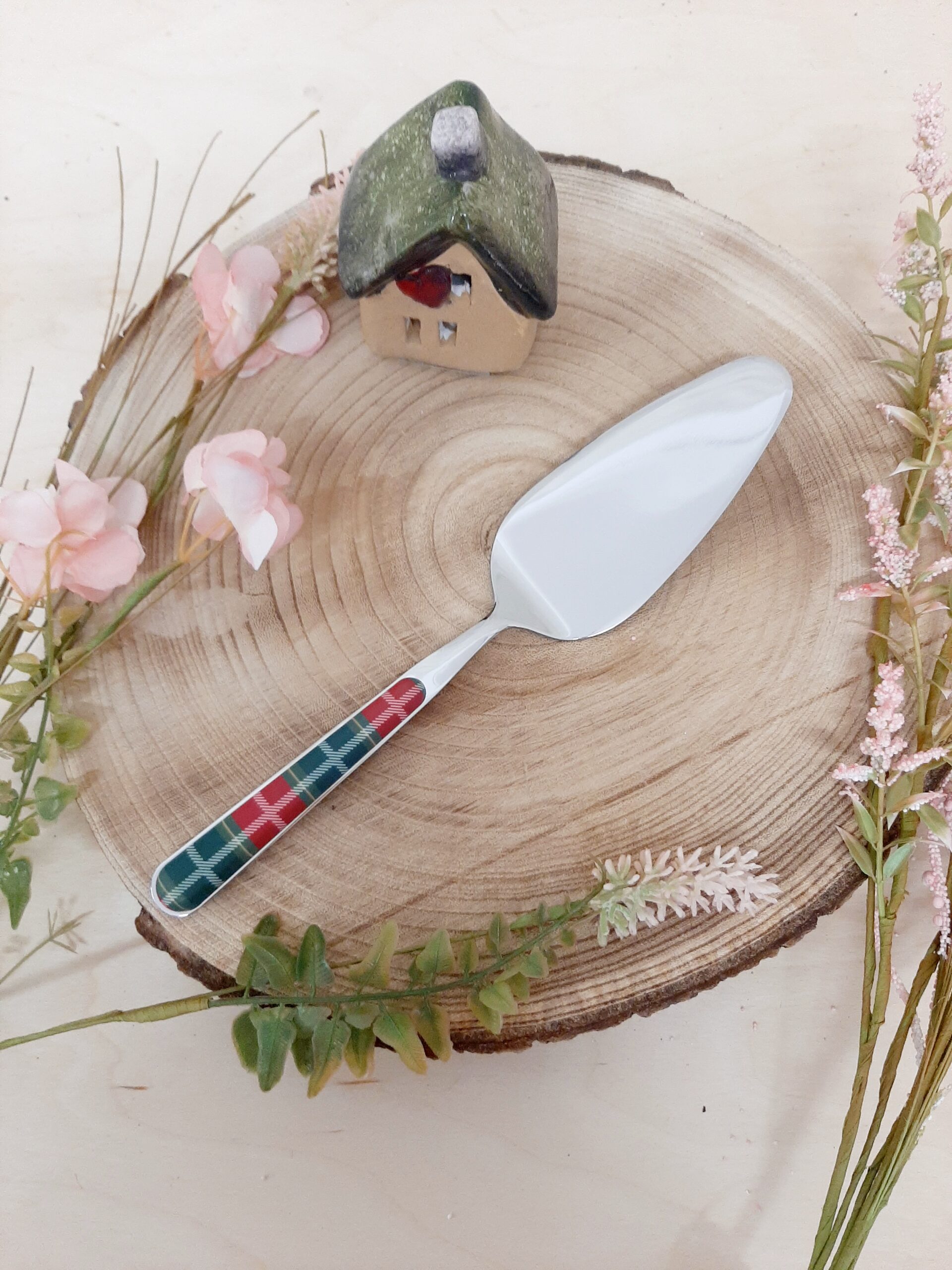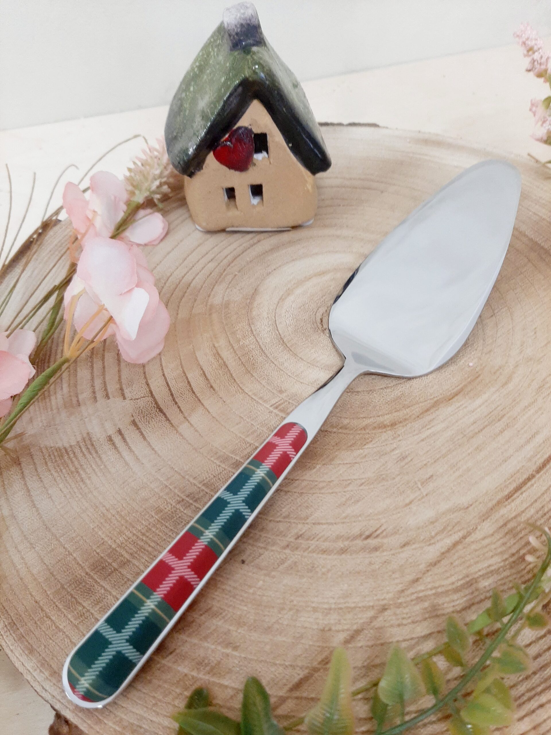 Pala torta in acciaio inox e manicatura a sandwich, disegno tartan verde/rosso. Prodotte dall’azienda italiana Neva.