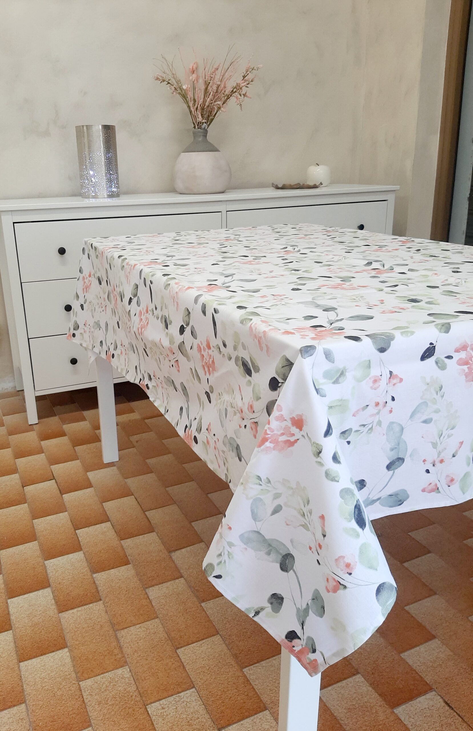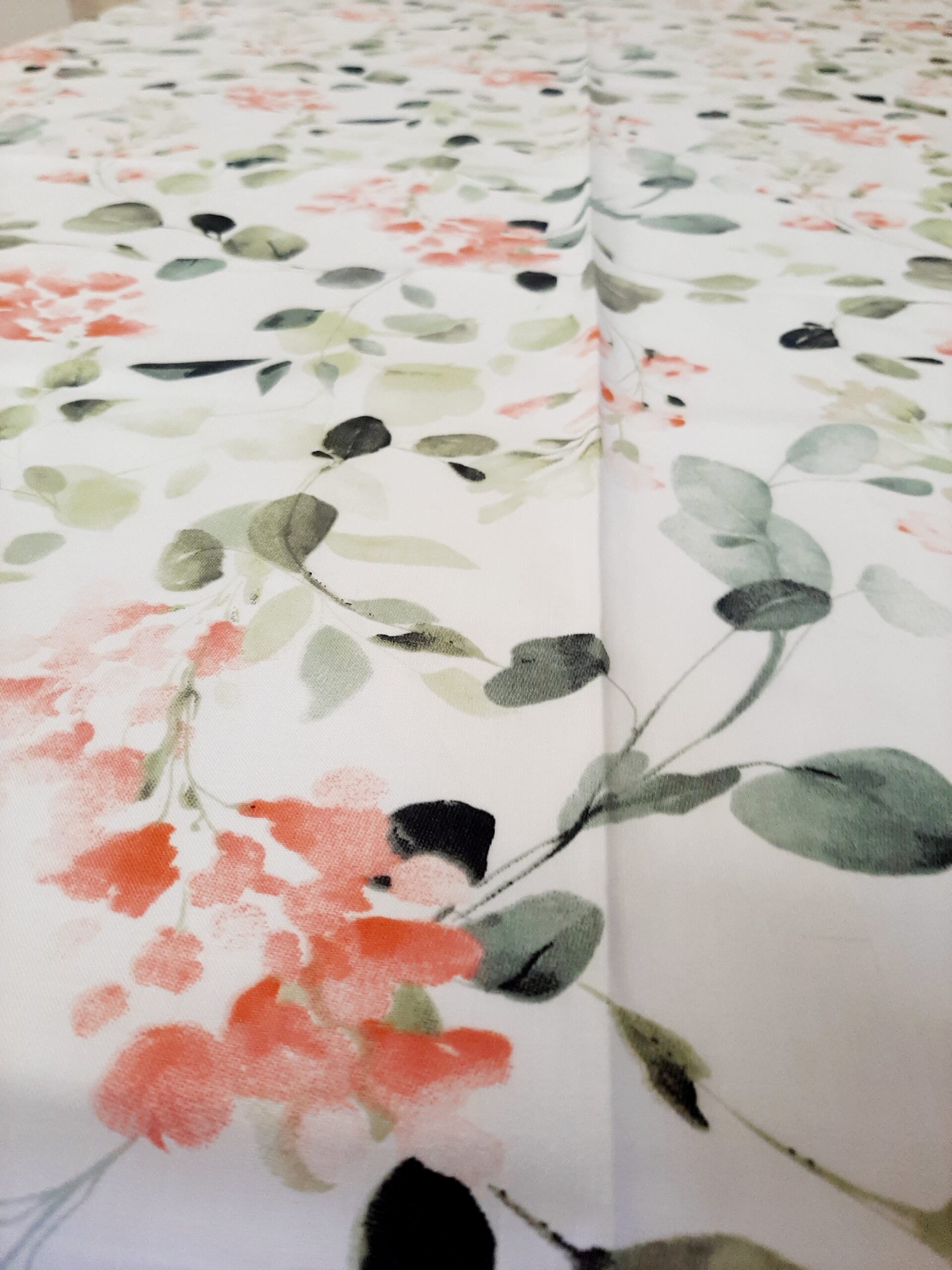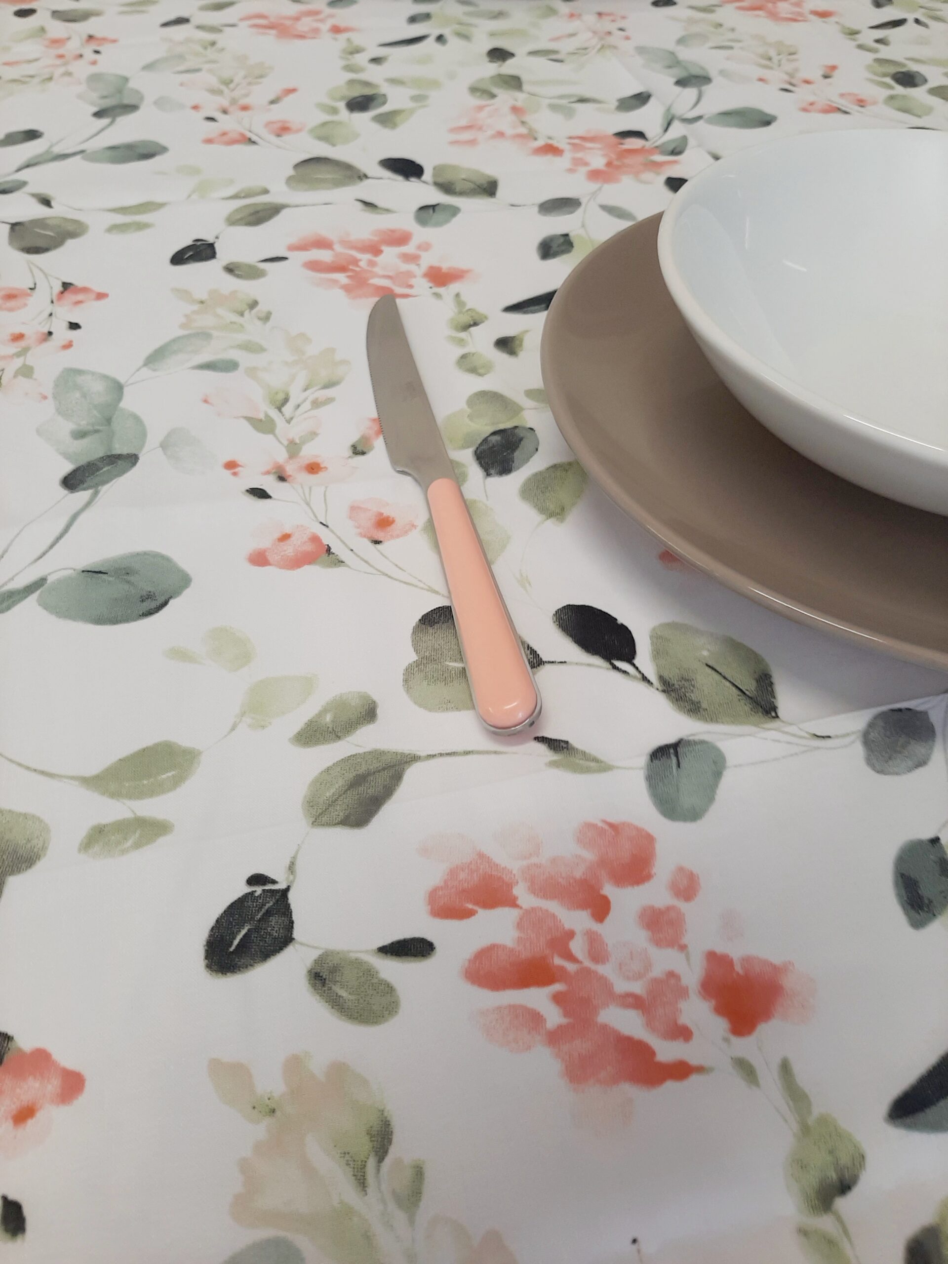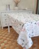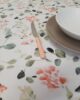 Tovaglia Primavera X6, in tessuto 100% cotone con delicato decoro fiori primaverili nei colori pastello rosa e verde.