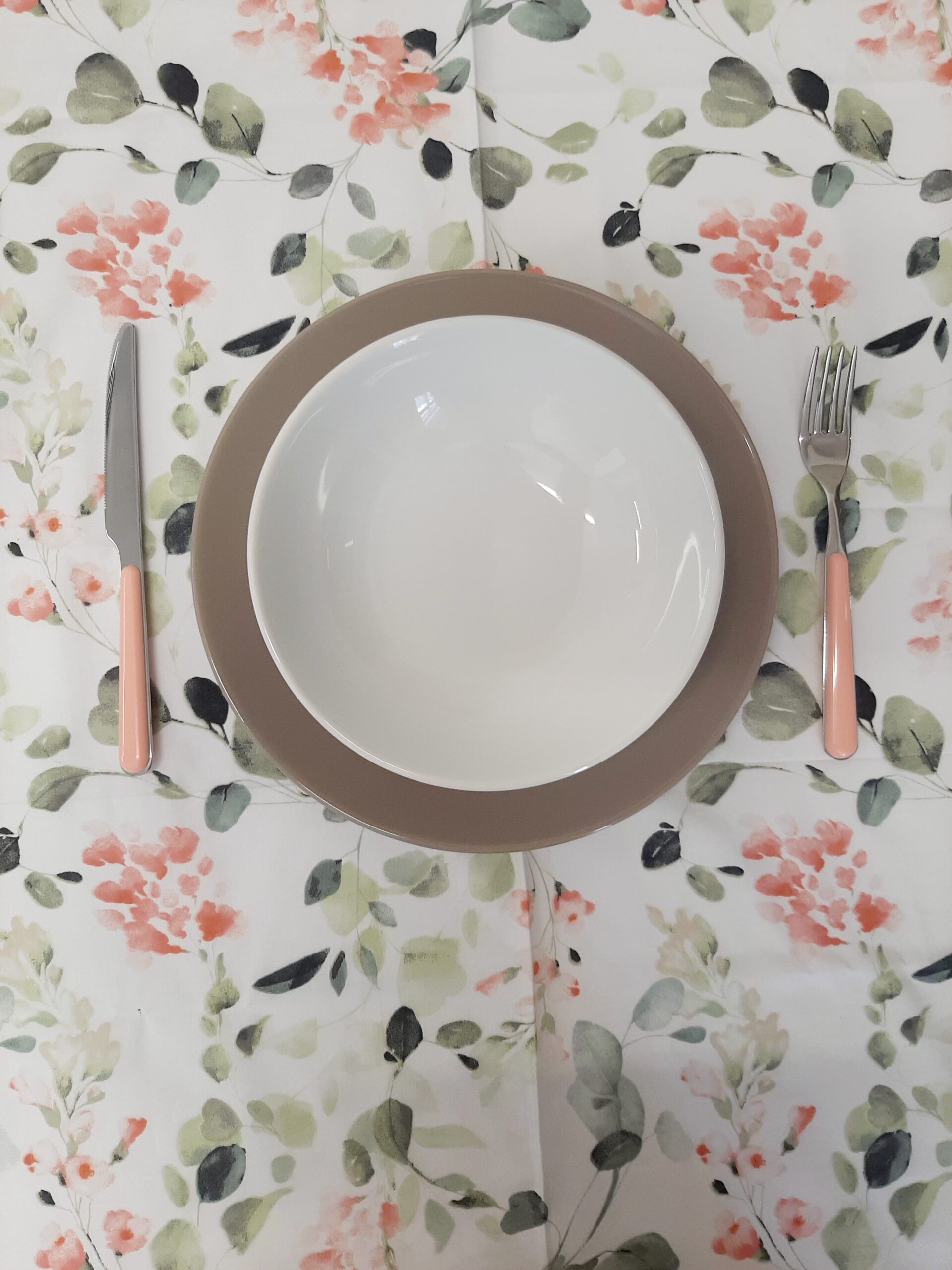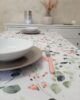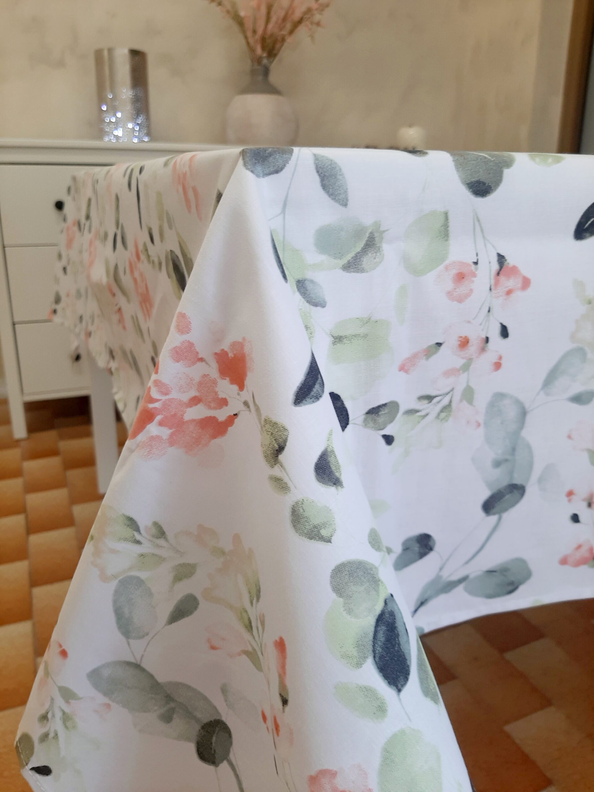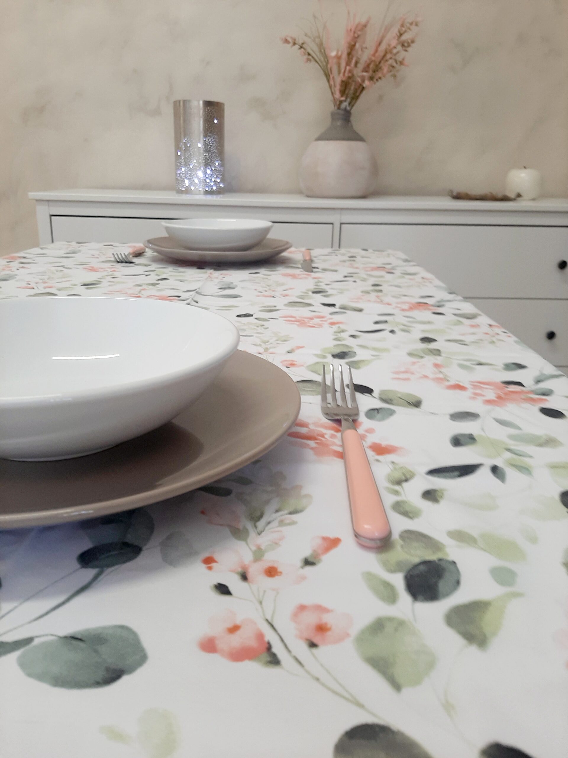 Tovaglia Primavera X6, in tessuto 100% cotone con delicato decoro fiori primaverili nei colori pastello rosa e verde.