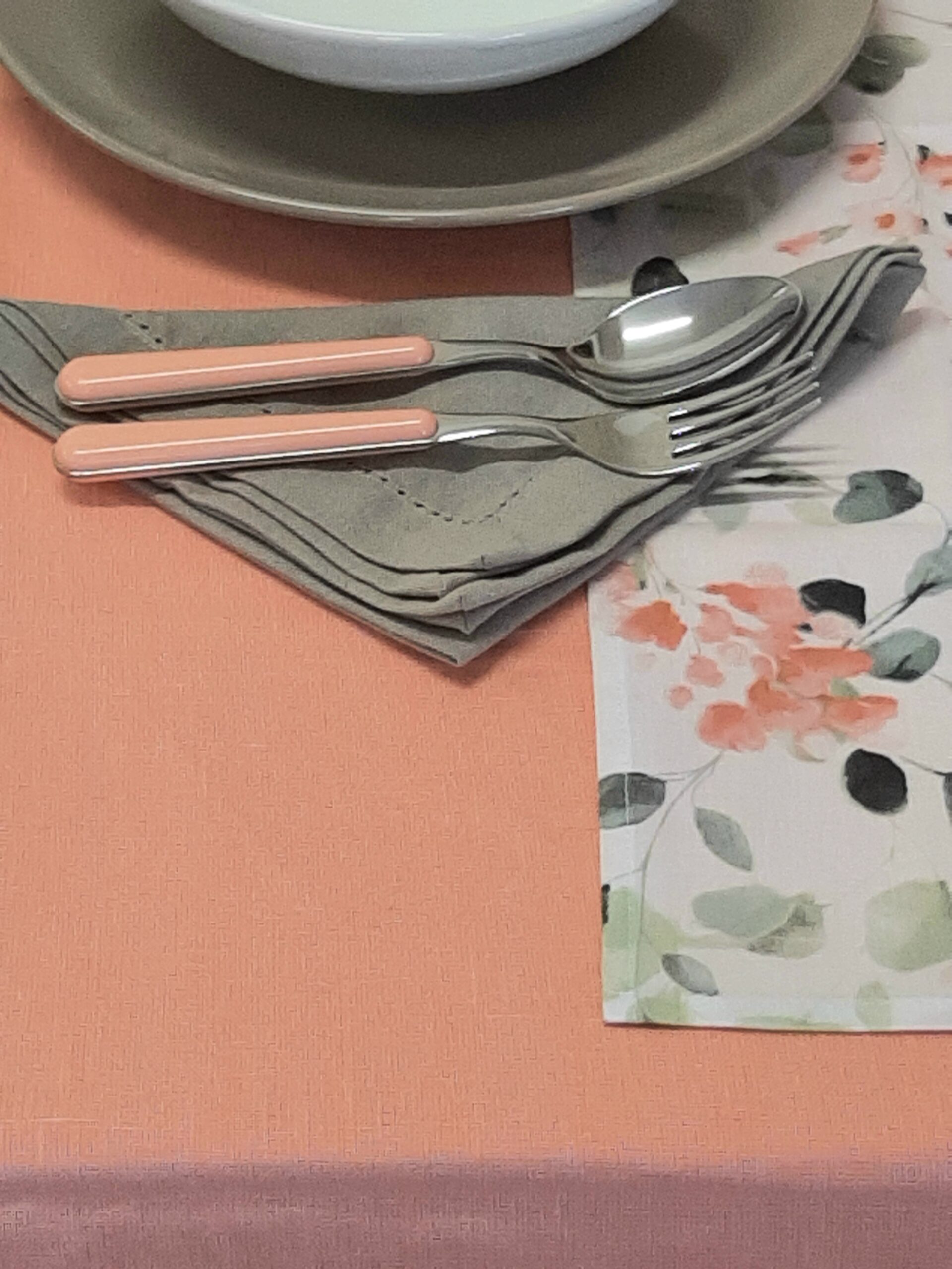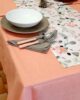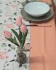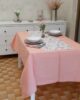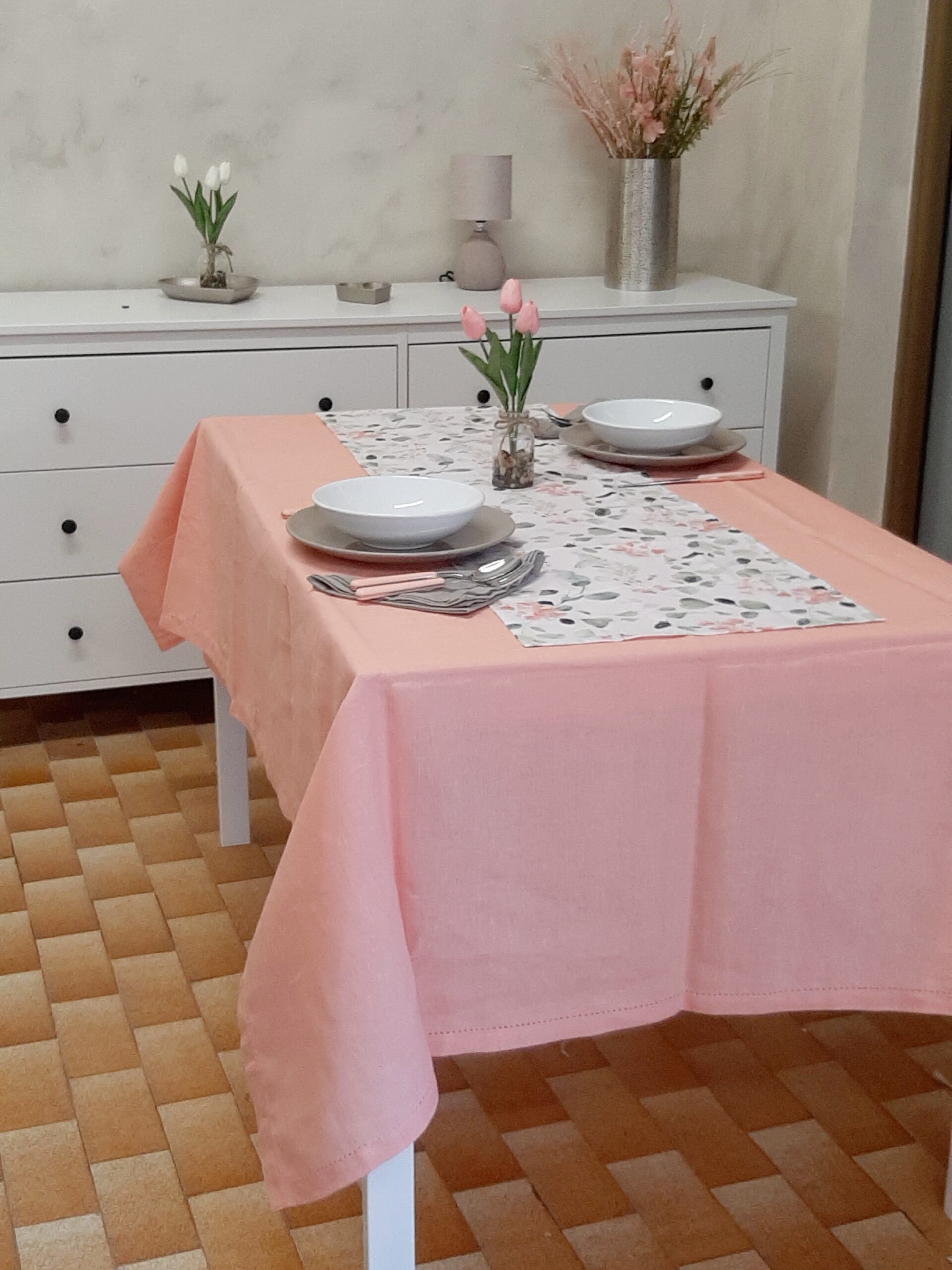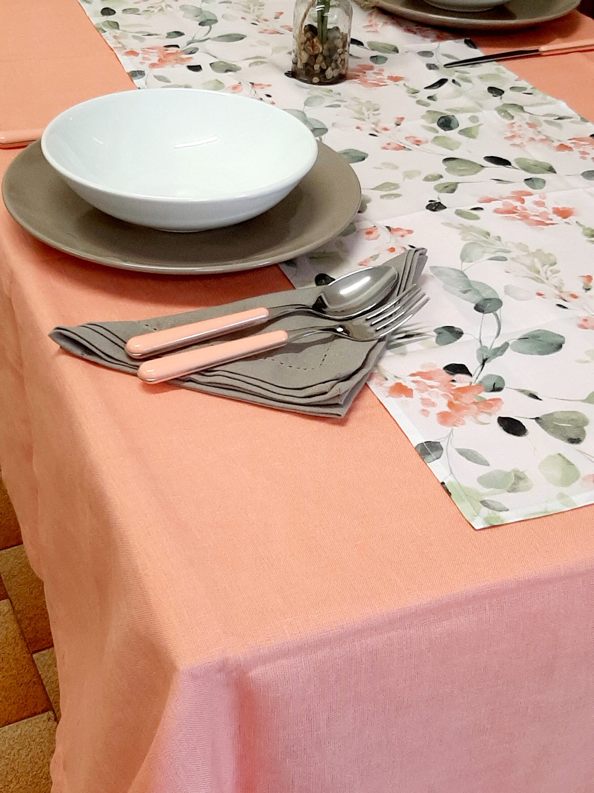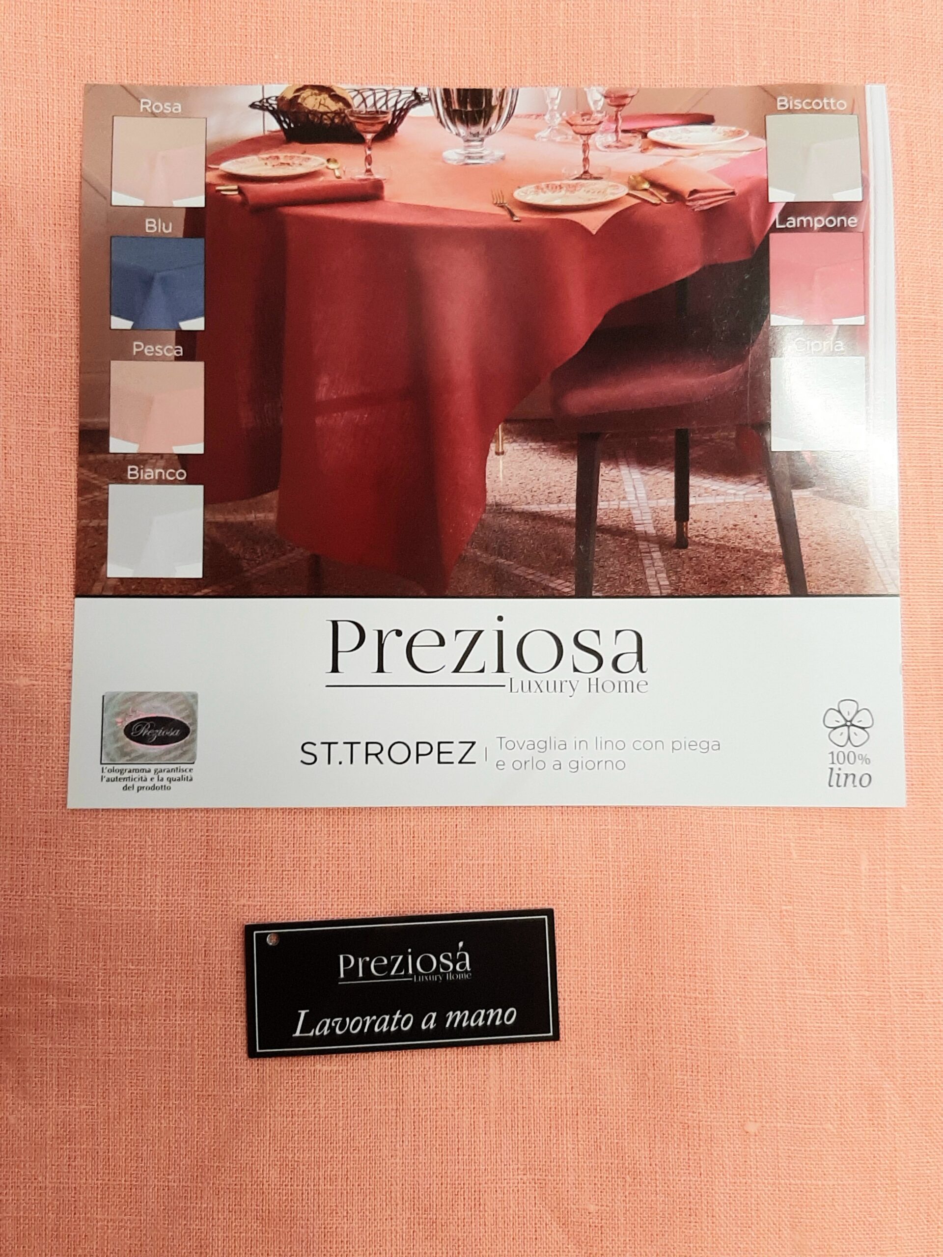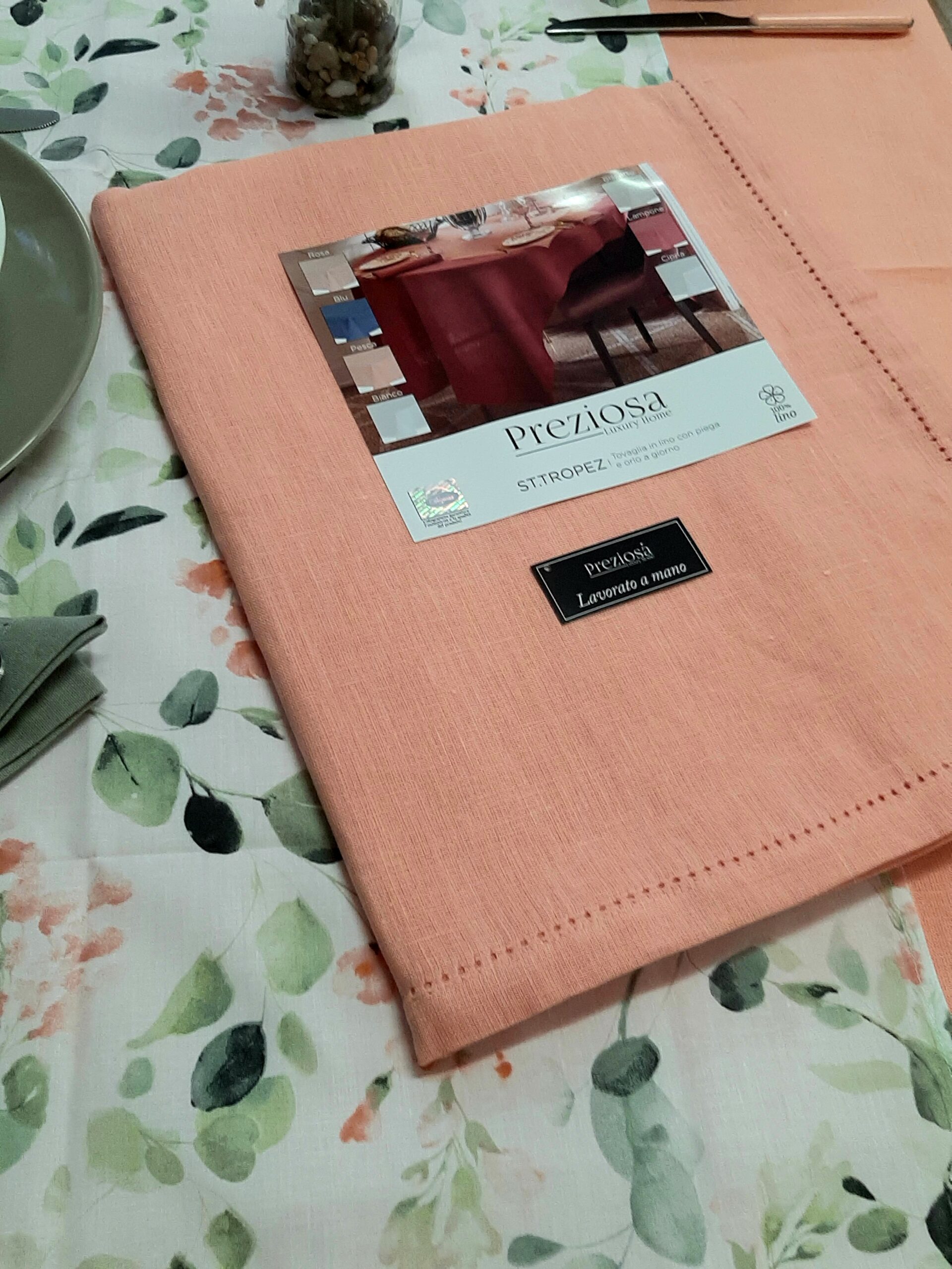 Tovaglia x12 persone, in puro lino 100% con piega e orlo a giorno. Eleganza e morbidezza in uno splendido e vivace colore Pesco, prodotta dall’azienda Preziosa Luxury Home.