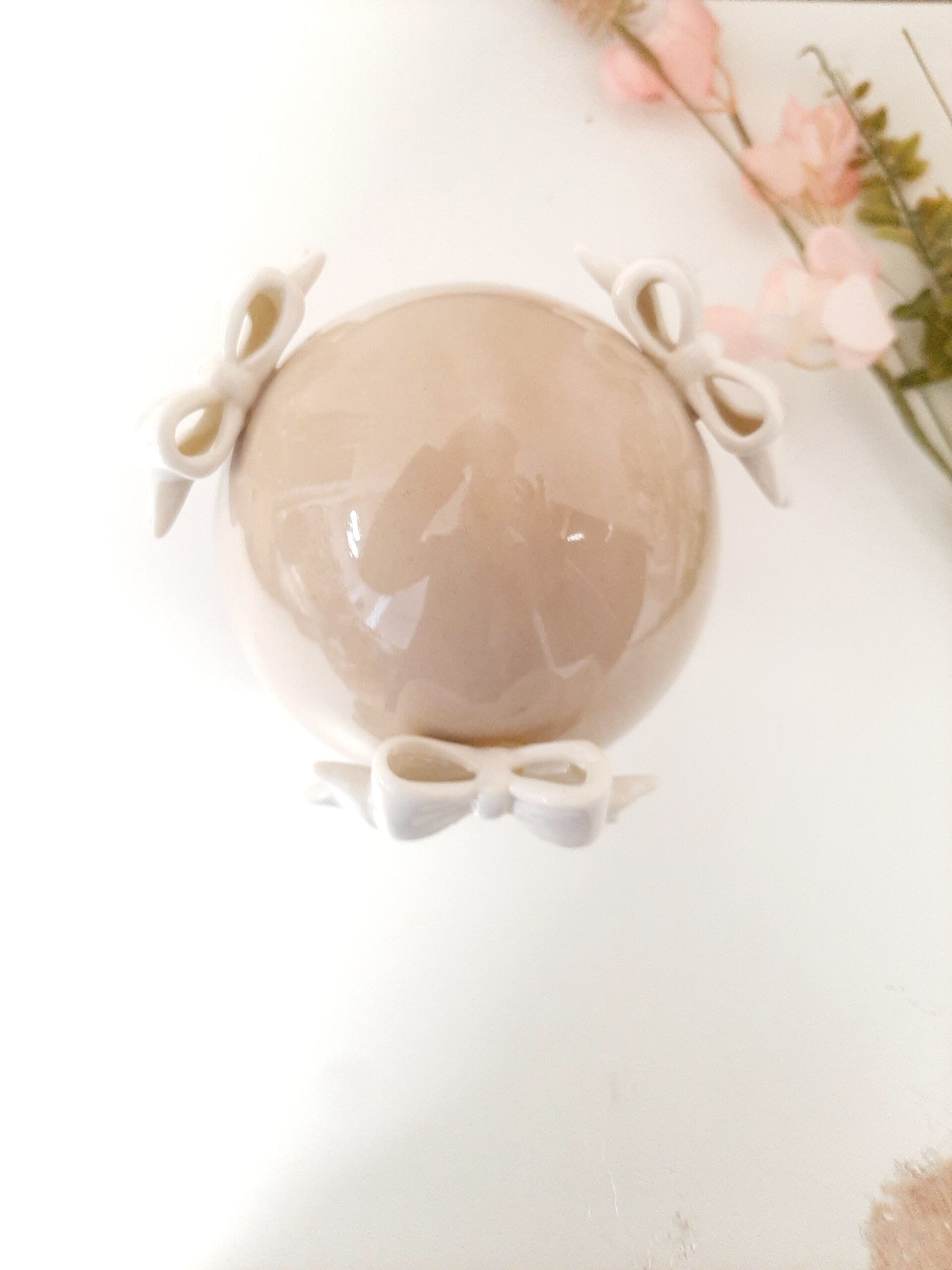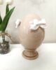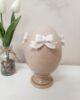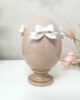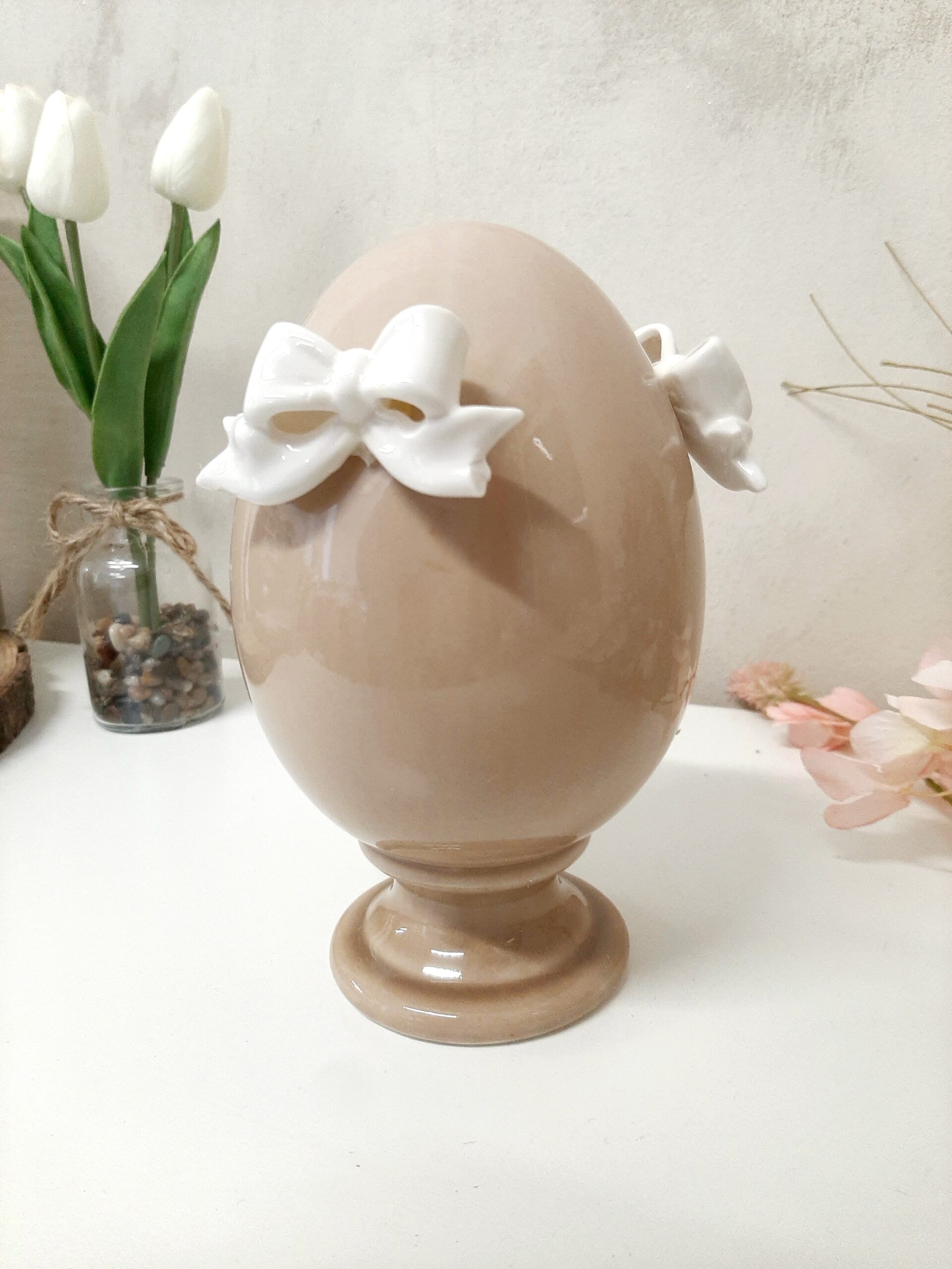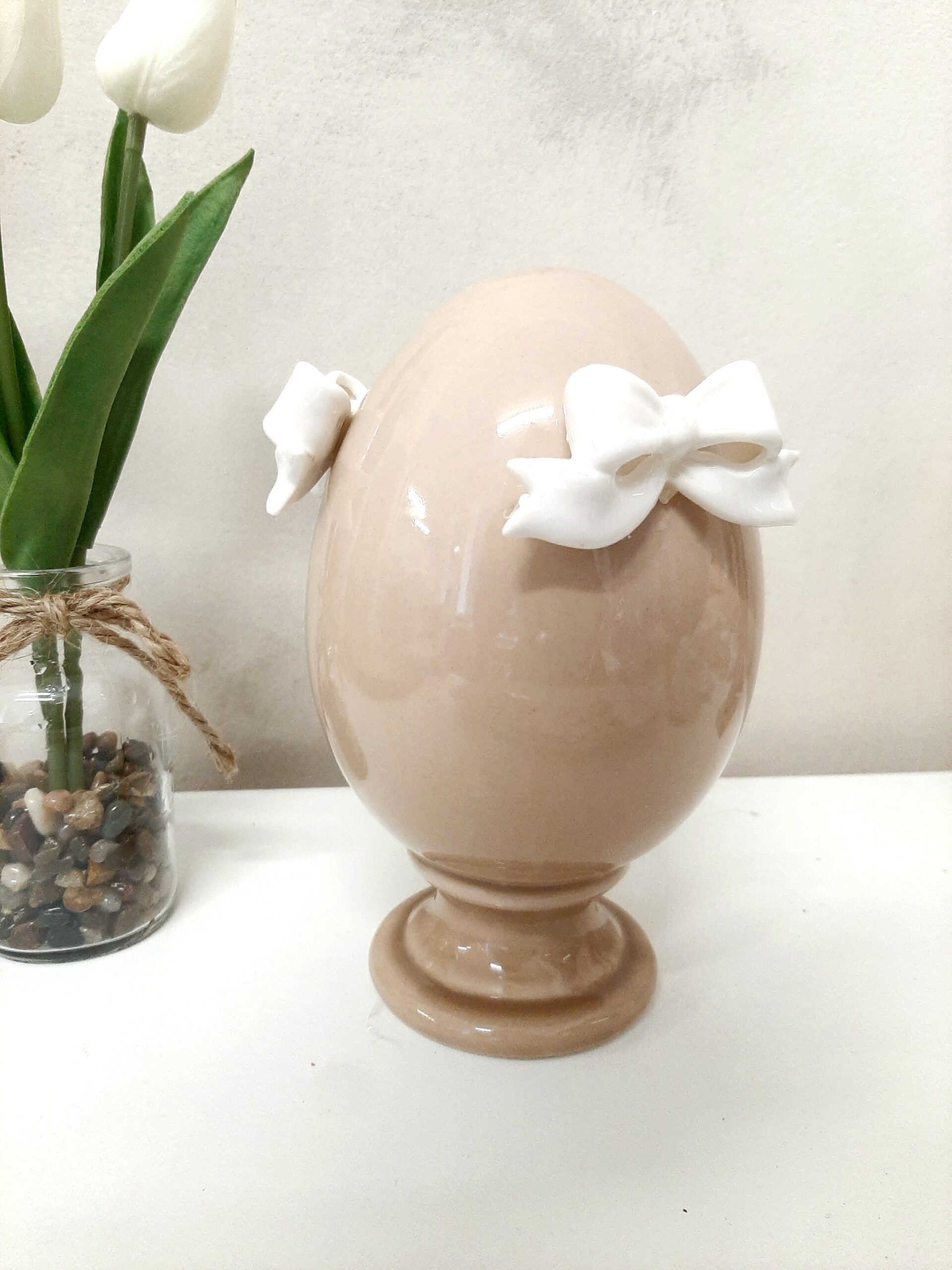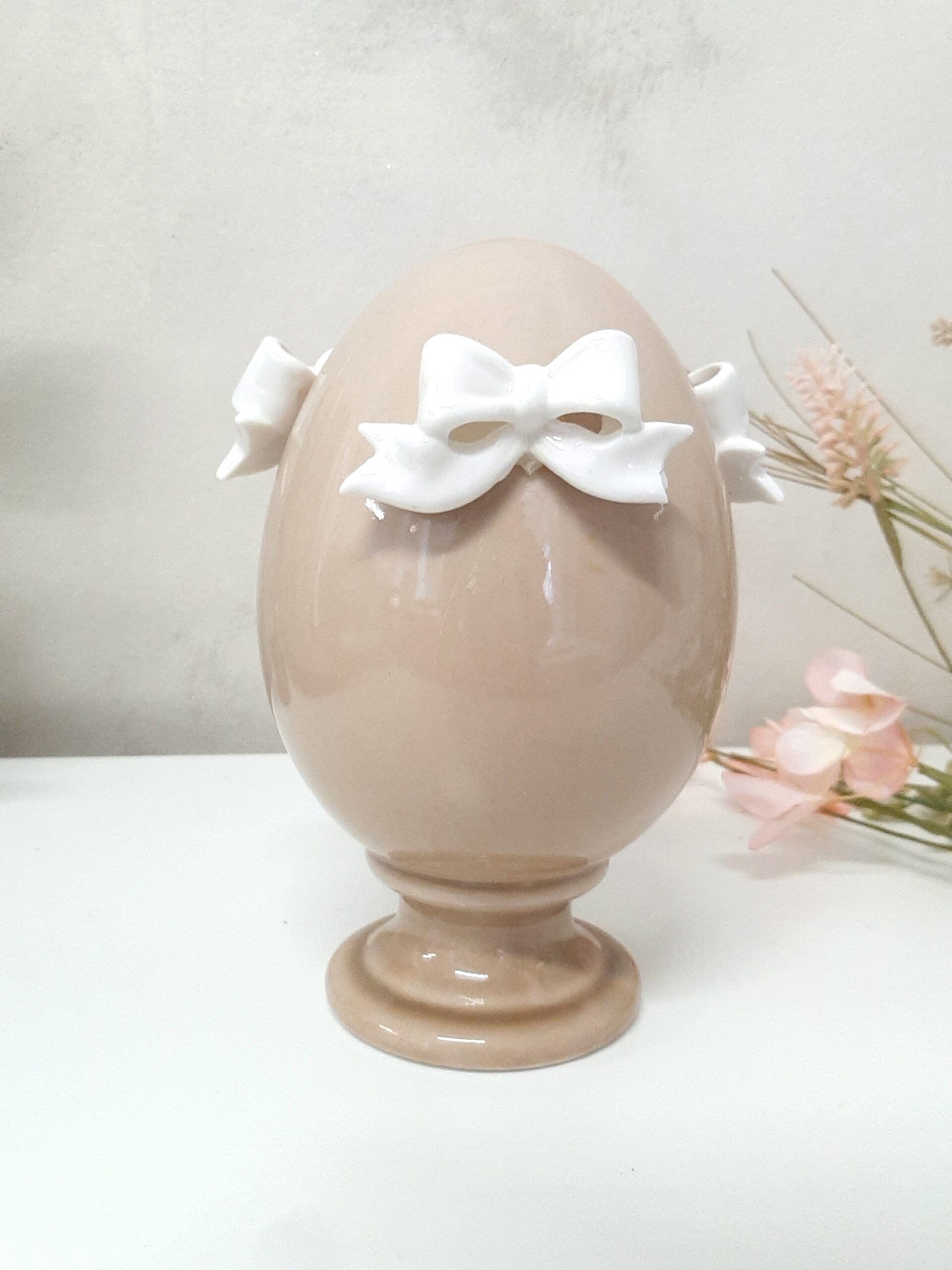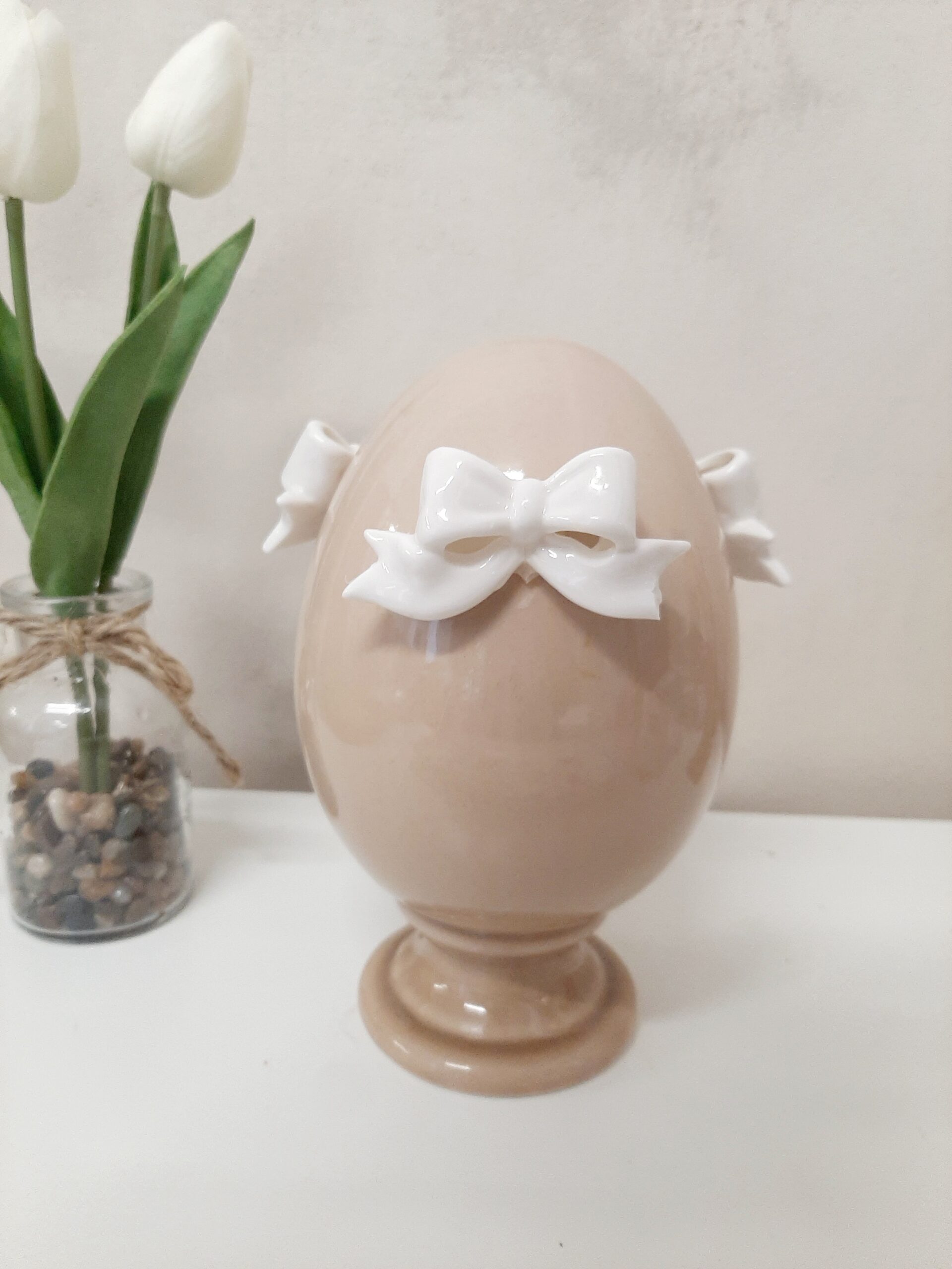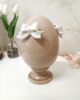 Uovo decorativo in porcellana con decoro fiocchi, Preziosa Luxury, beige con fiocchi bianchi.