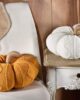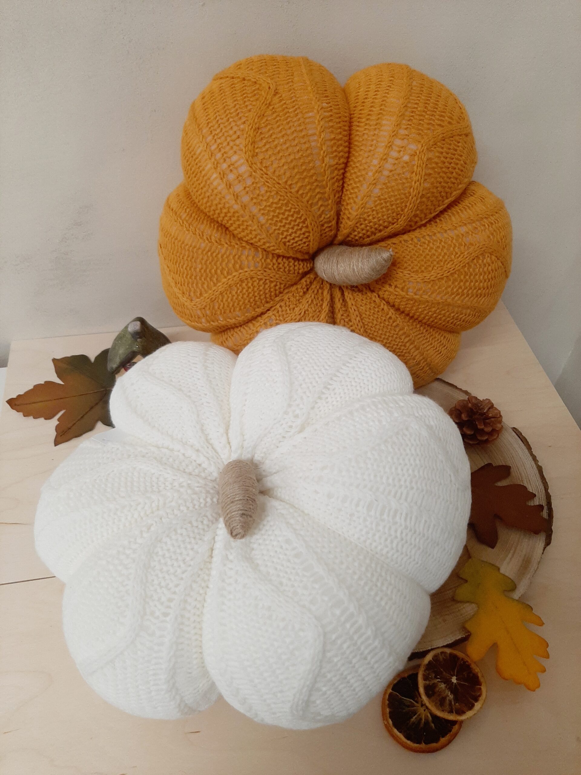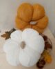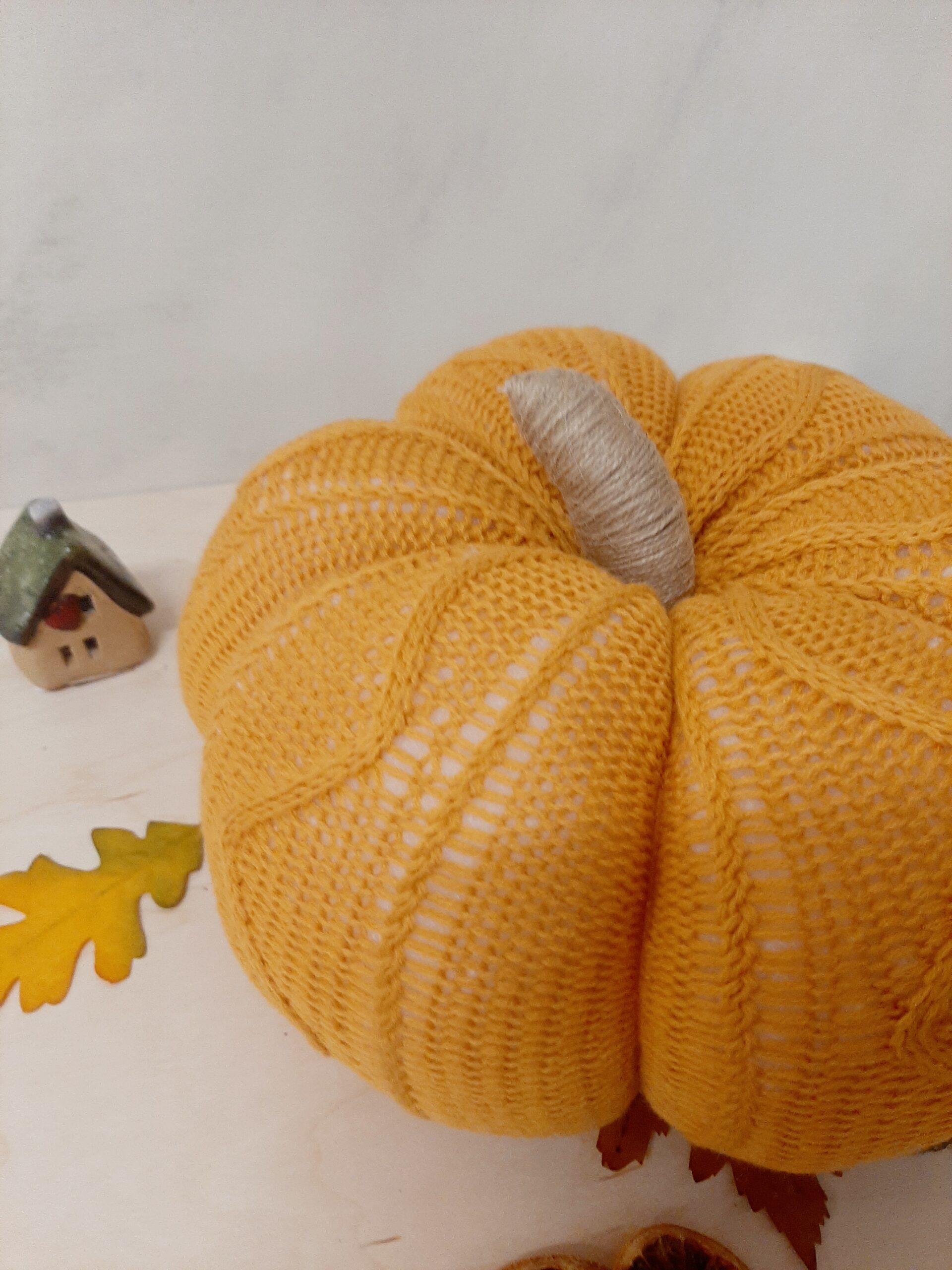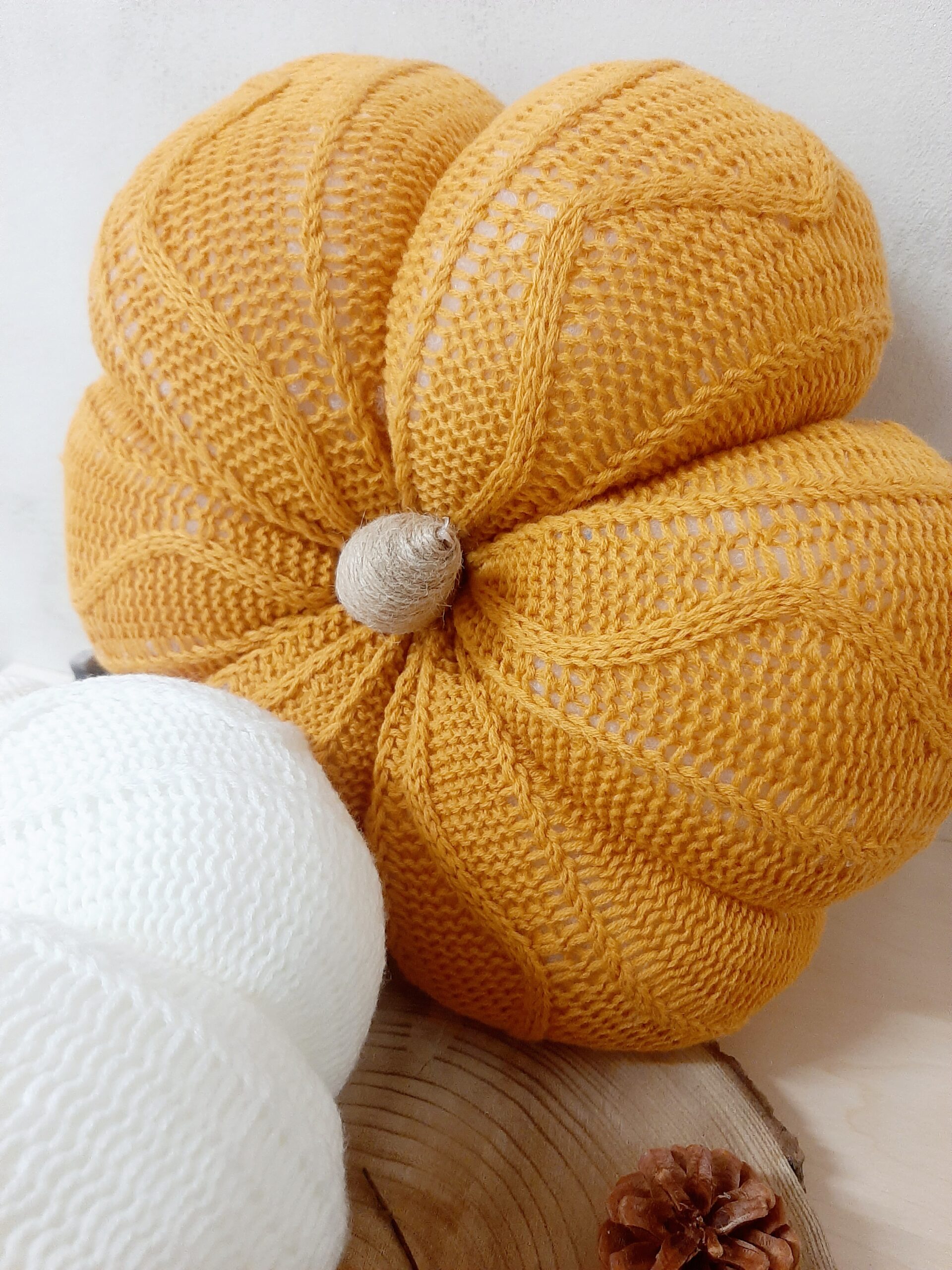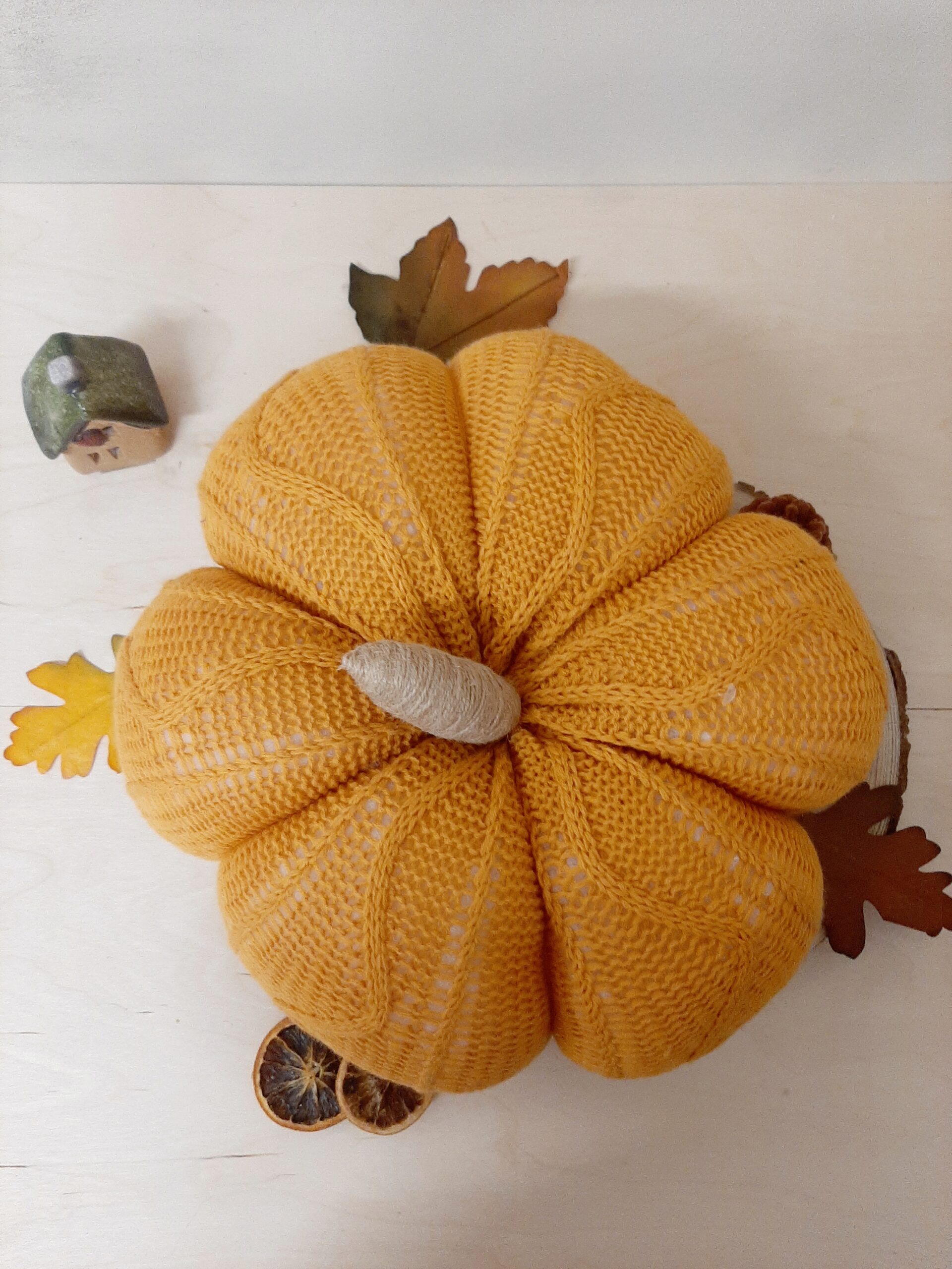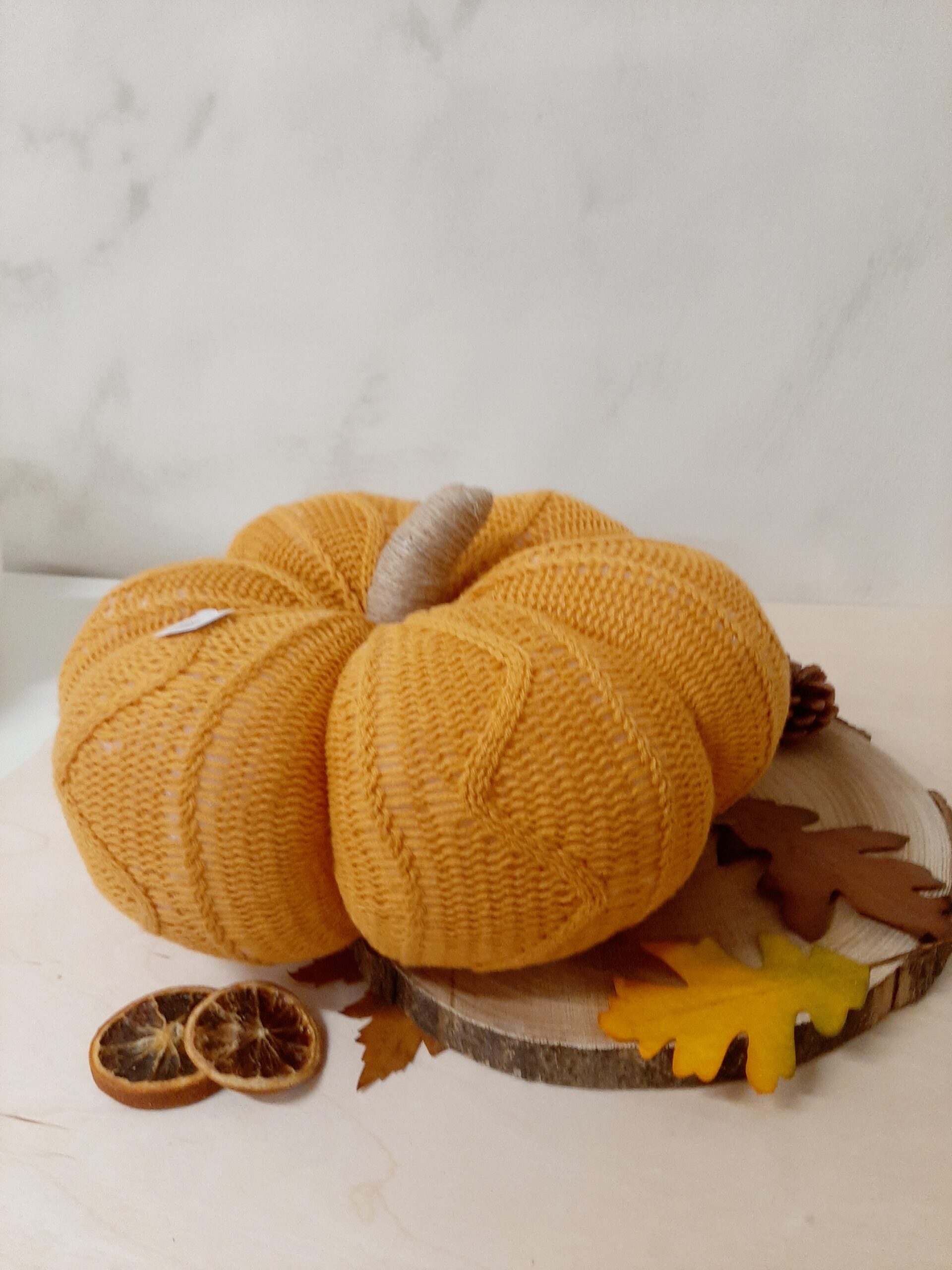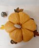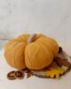 Zucca decorativa in maglia imbottita, colore arancione. Un morbido cuscino per decorare il tuo autunno.