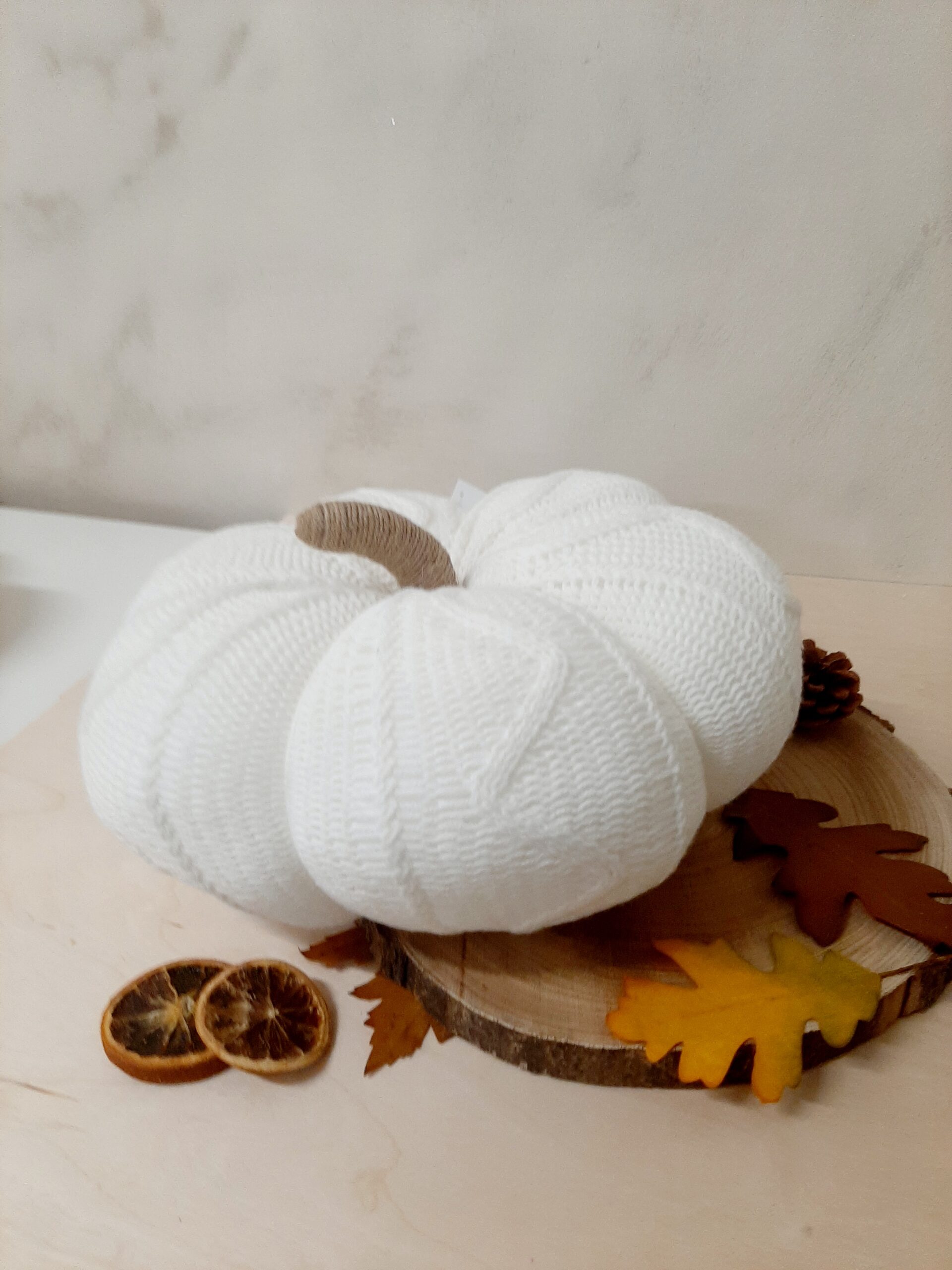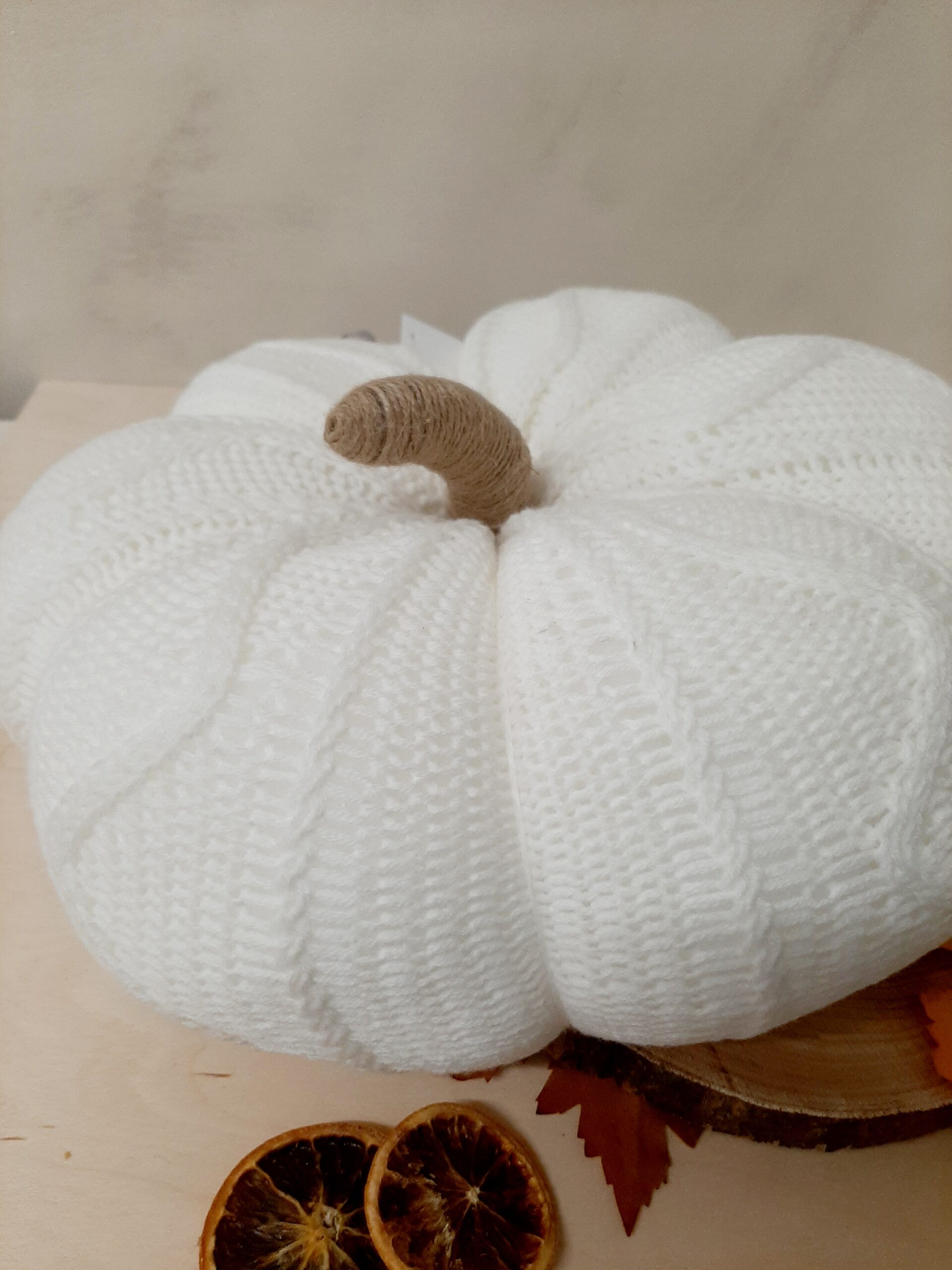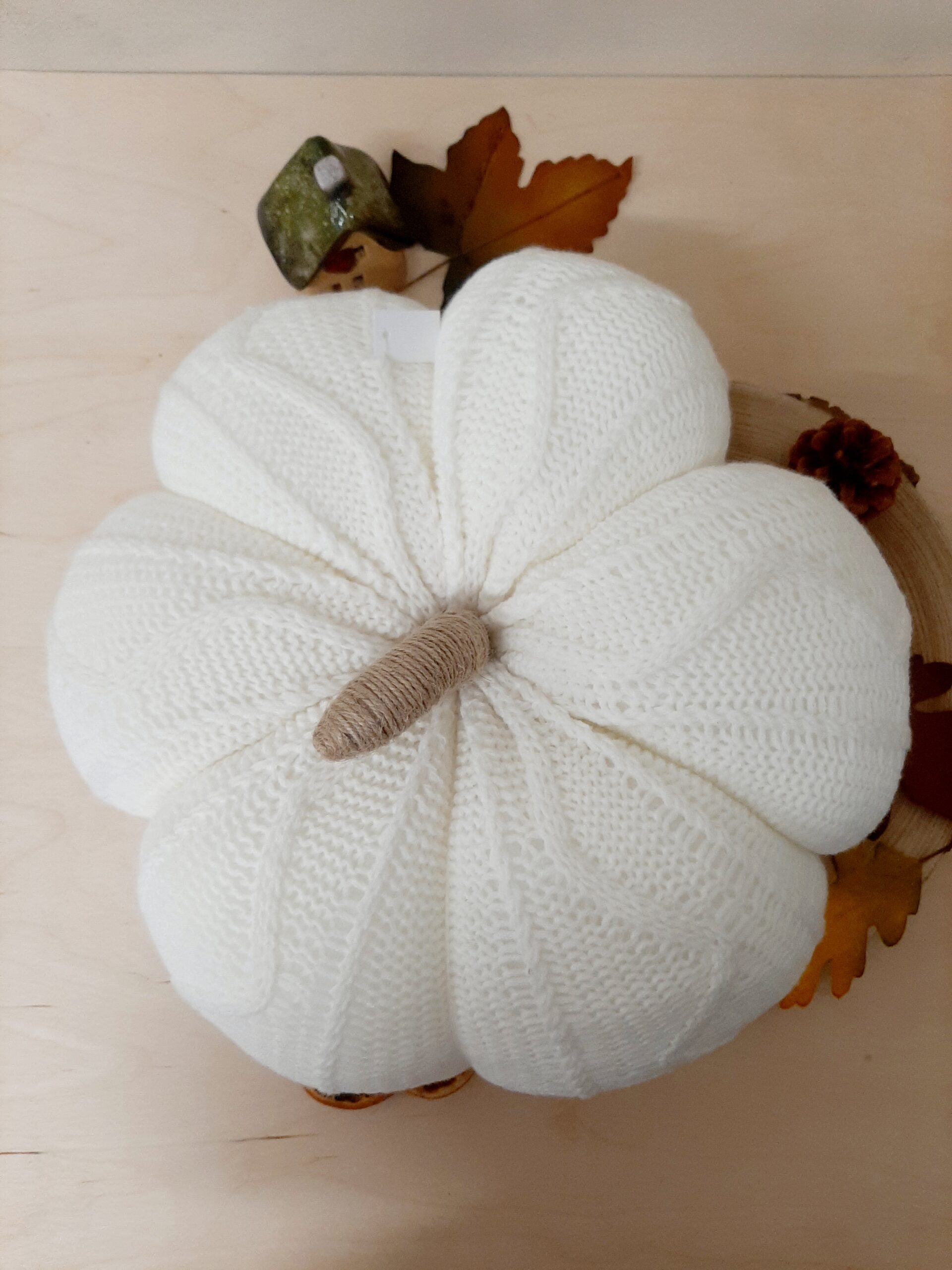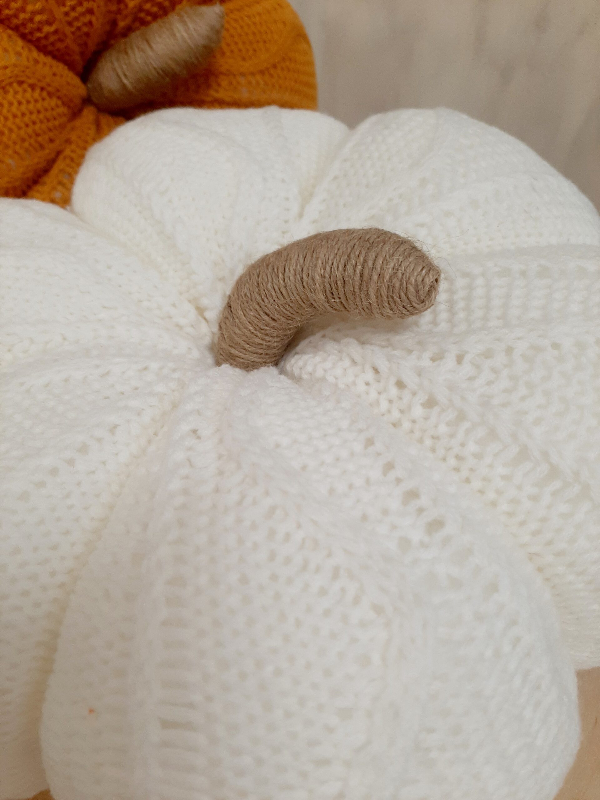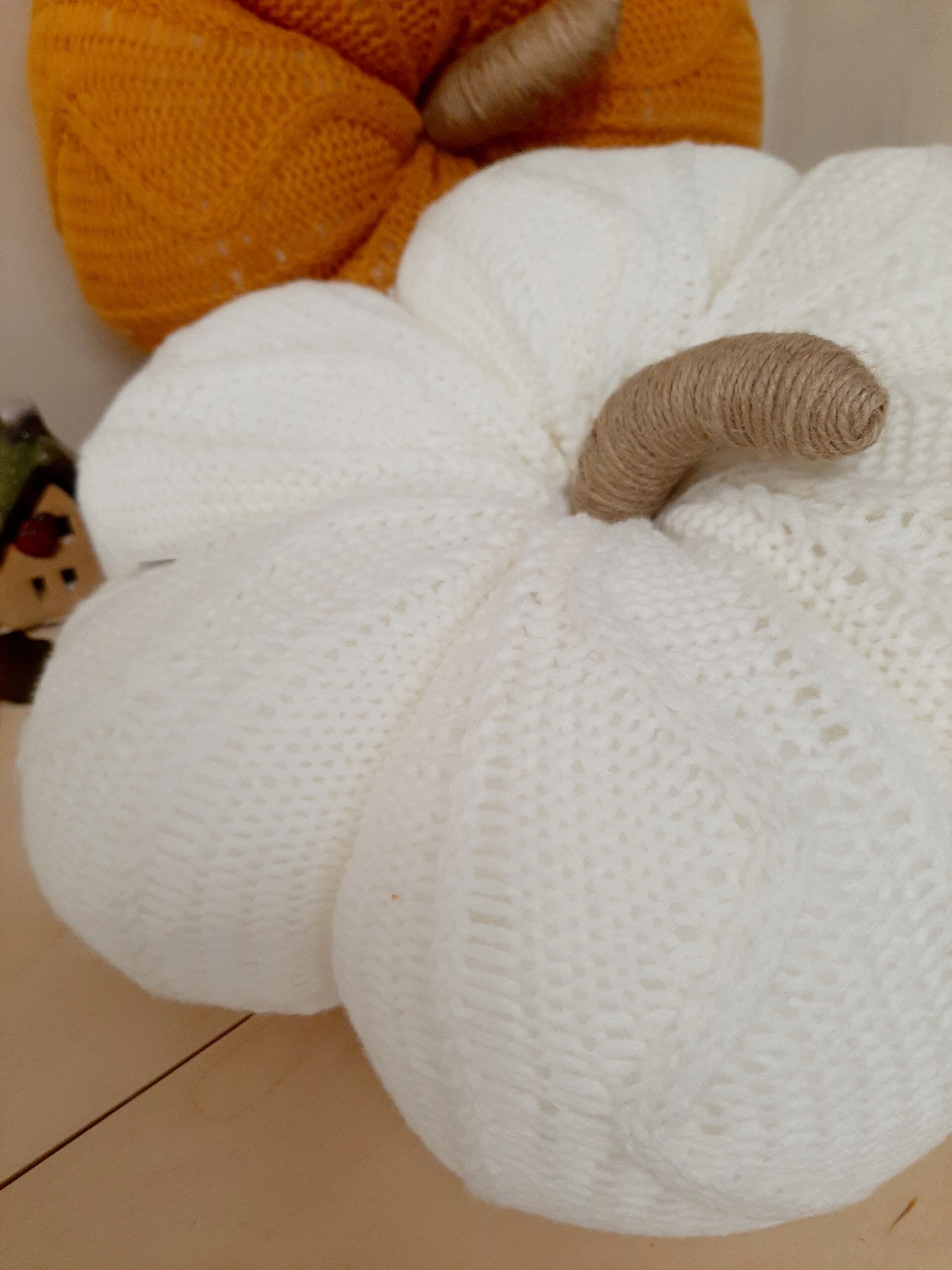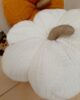 Zucca decorativa in maglia imbottita, colore bianco. Un morbido cuscino per decorare il tuo autunno.